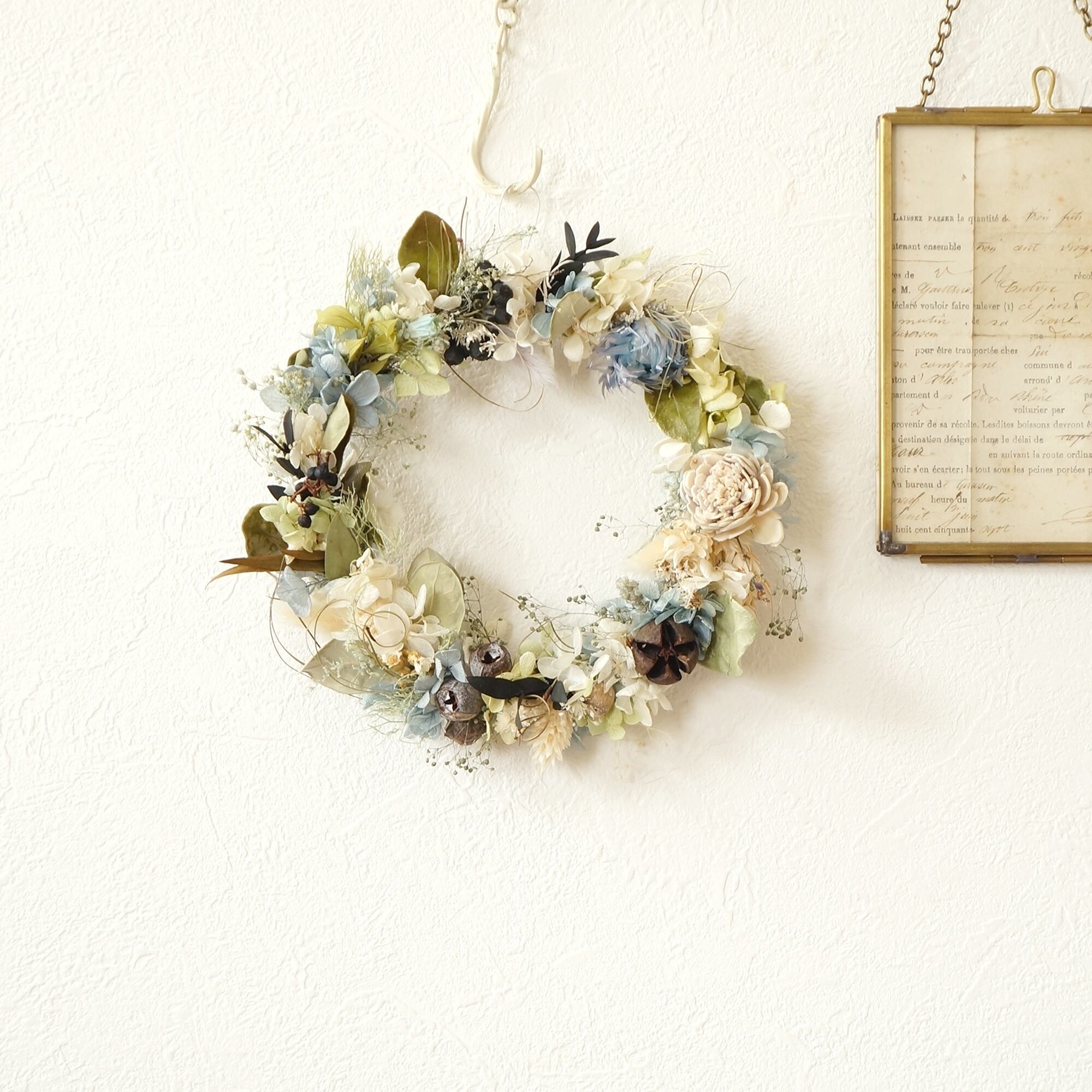 ドライフラワーとプリザーブドフラワー、木の実など本物の植物を使ったナチュラルなリースです。