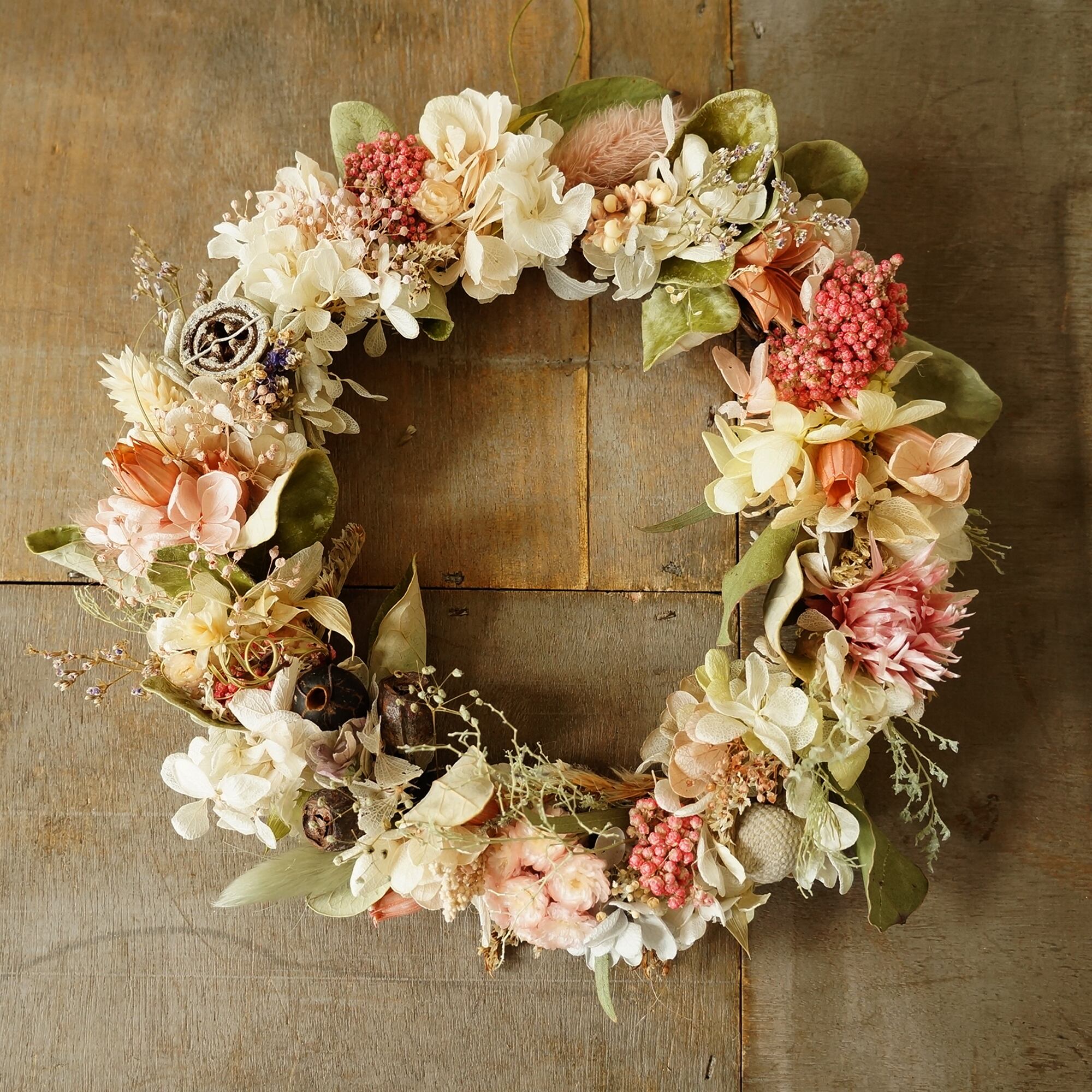 ドライフラワーとプリザーブドフラワー、木の実など本物の植物を使ったナチュラルなリースです。