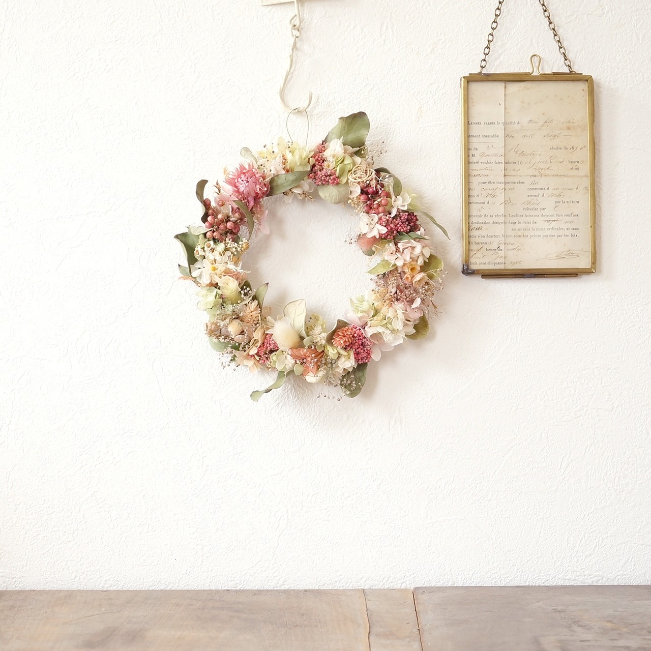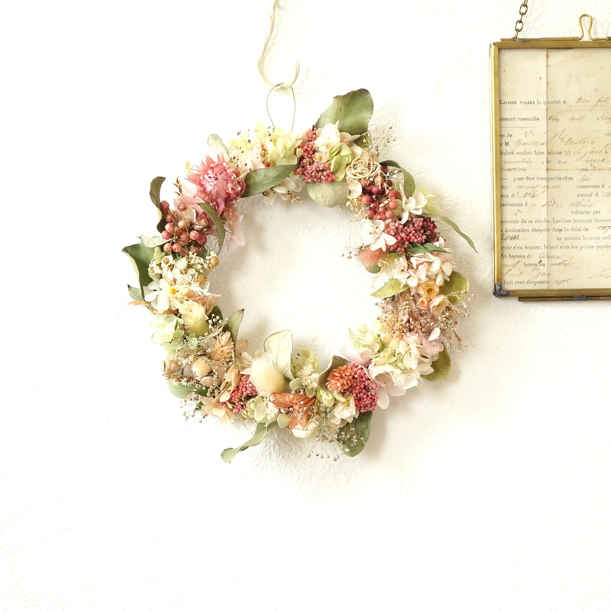 ドライフラワーとプリザーブドフラワー、木の実など本物の植物を使ったナチュラルなリースです。