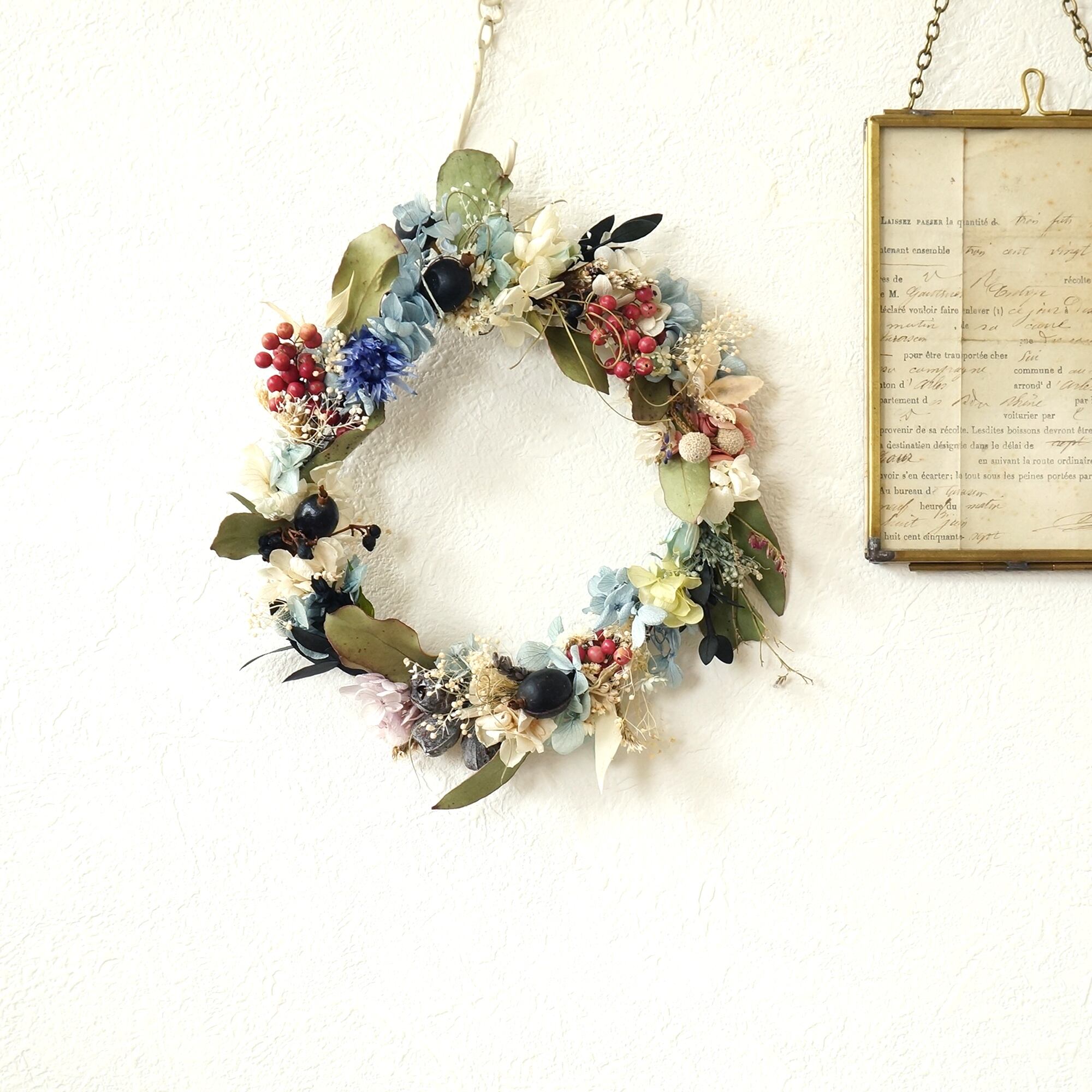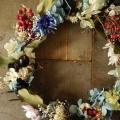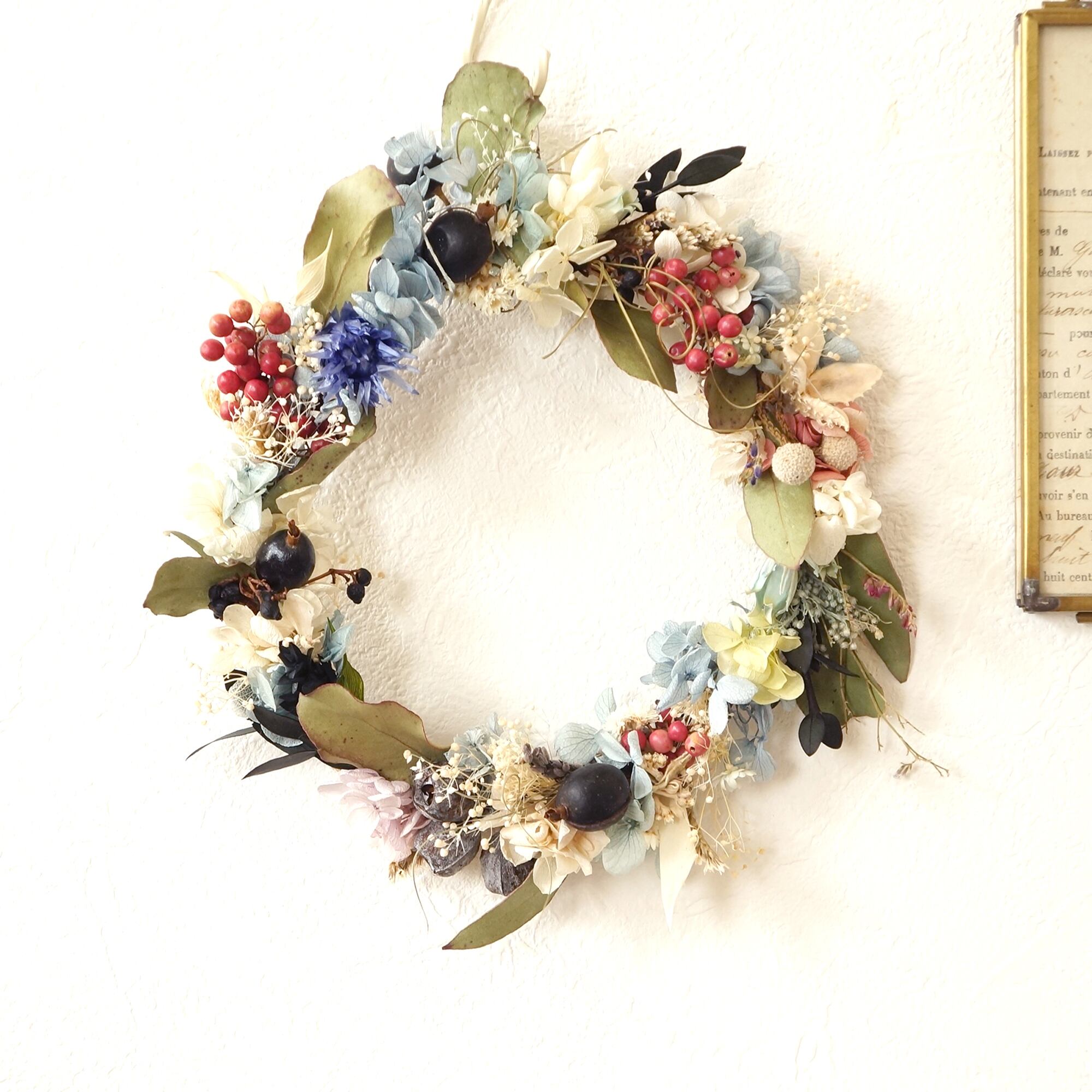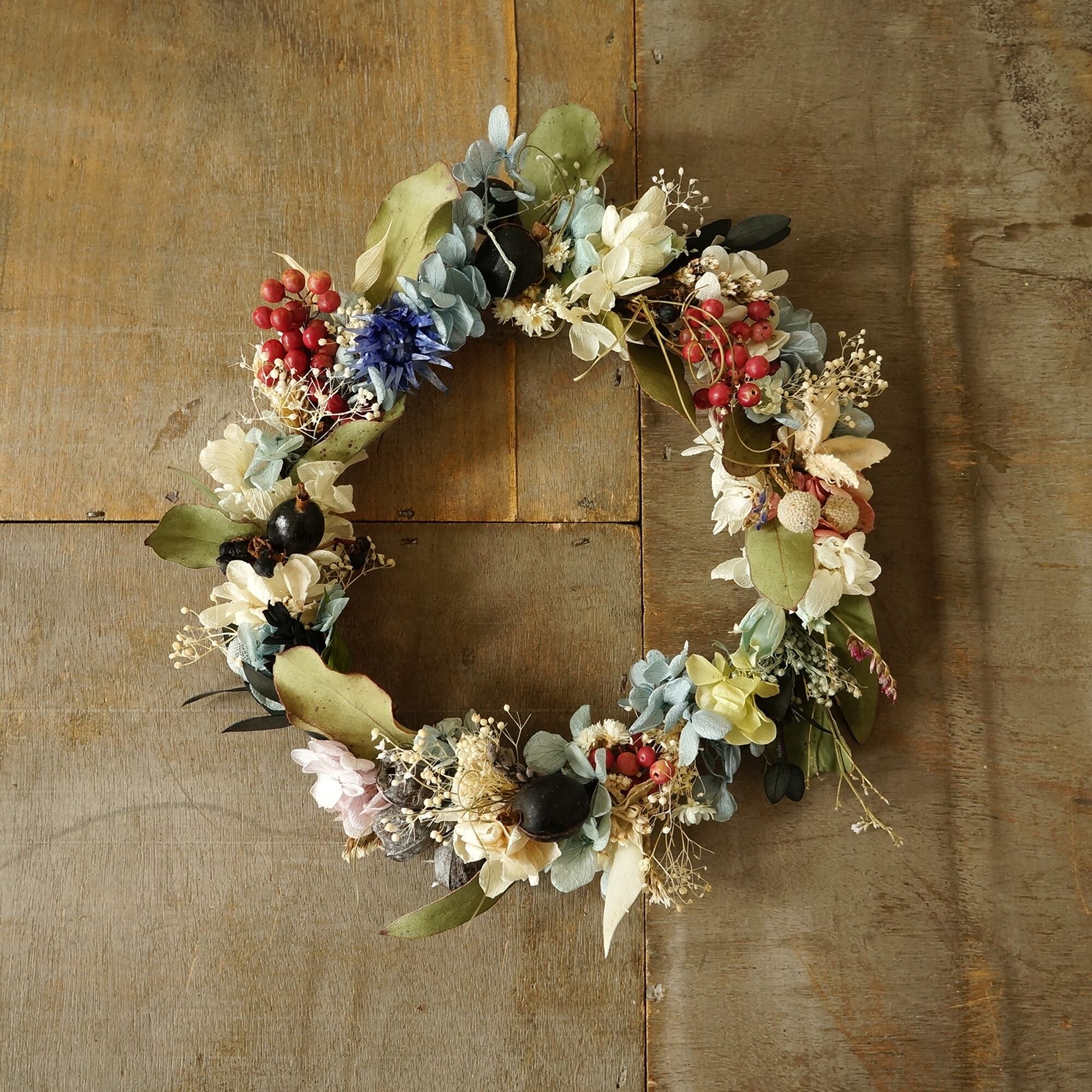 ピンクのペッパーベリーとブラックベリー、ブルーのお花のを合わせパキッとした印象のナチュラルリースです。