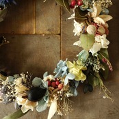 ドライフラワーとプリザーブドフラワー、木の実など本物の植物を使ったナチュラルなリースです。