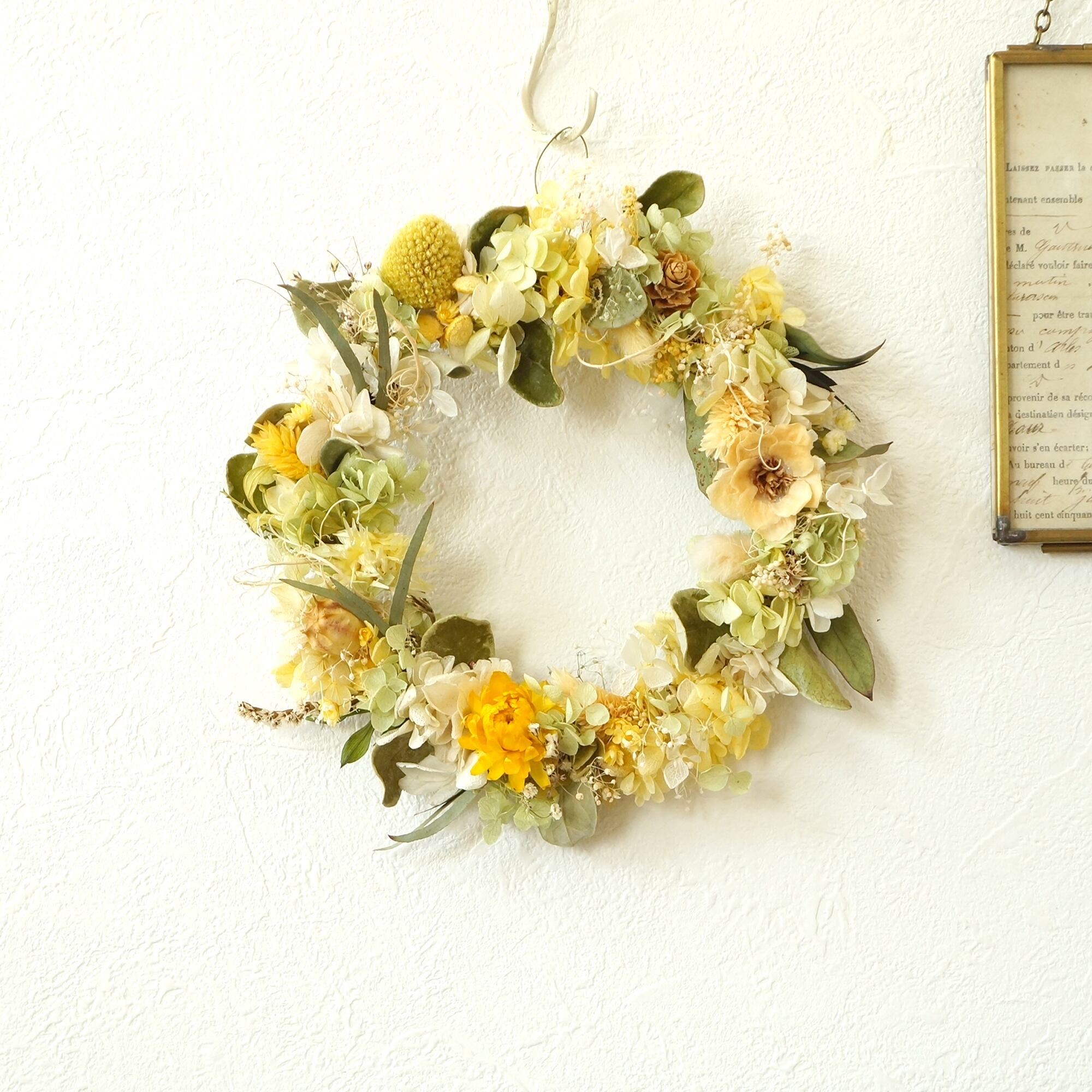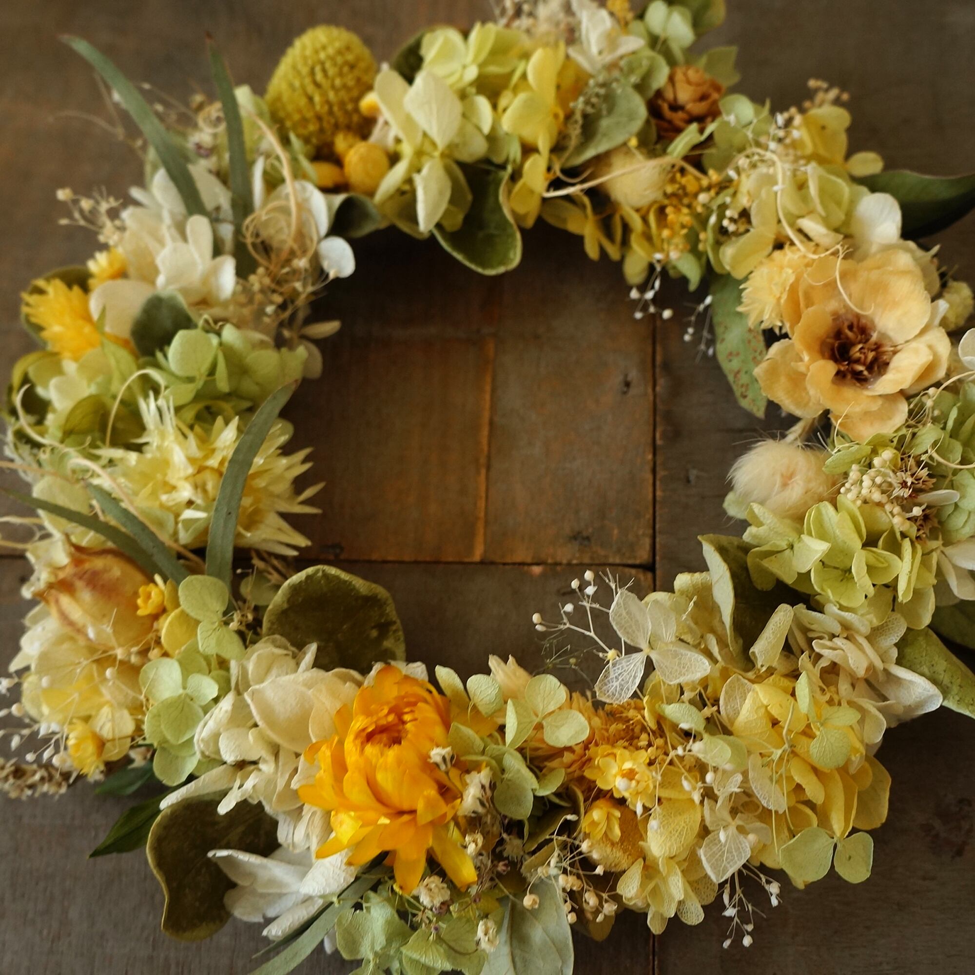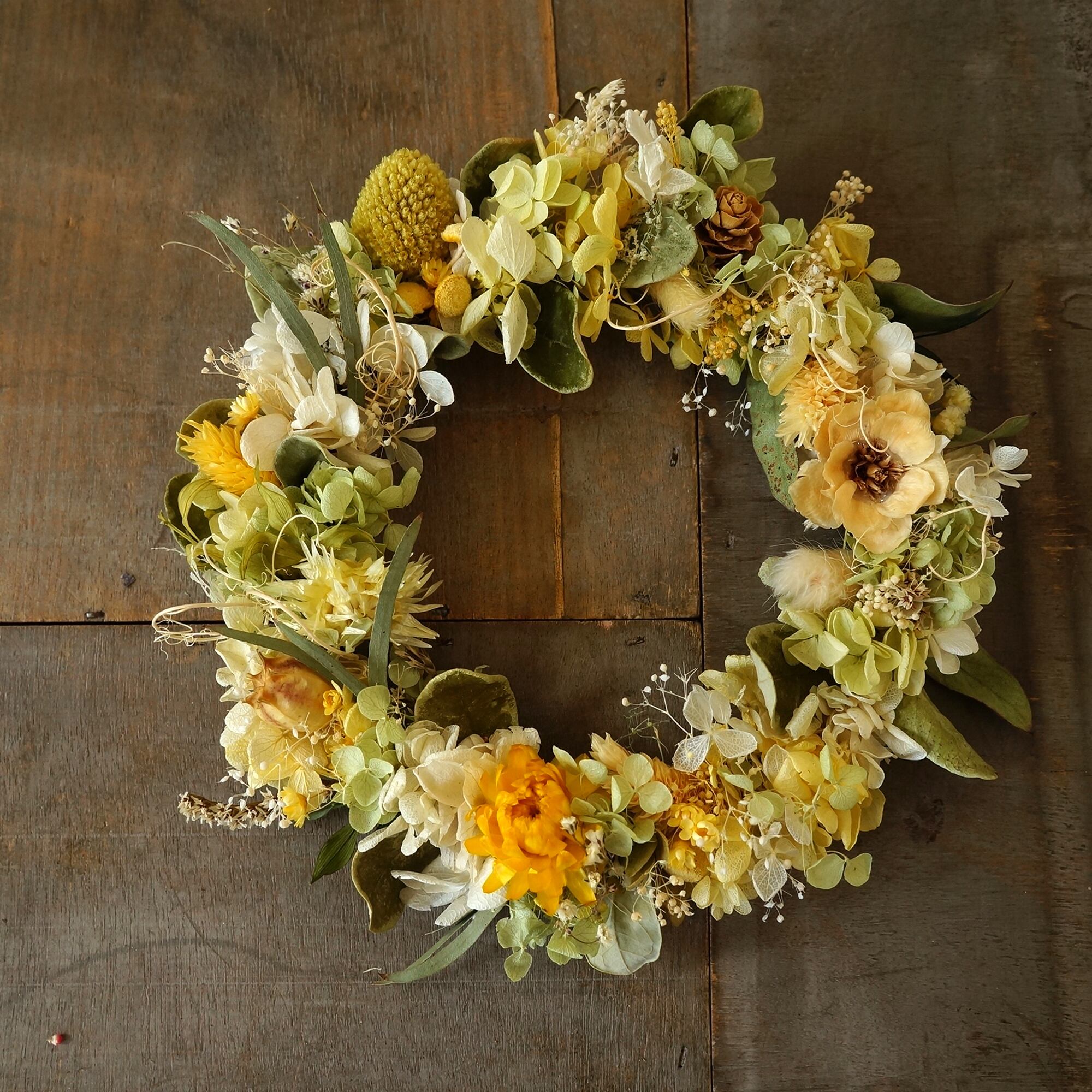 淡い色を中心に黄色の植物とグリーンの紫陽花を合わせて明るく華やかなリースにしました。