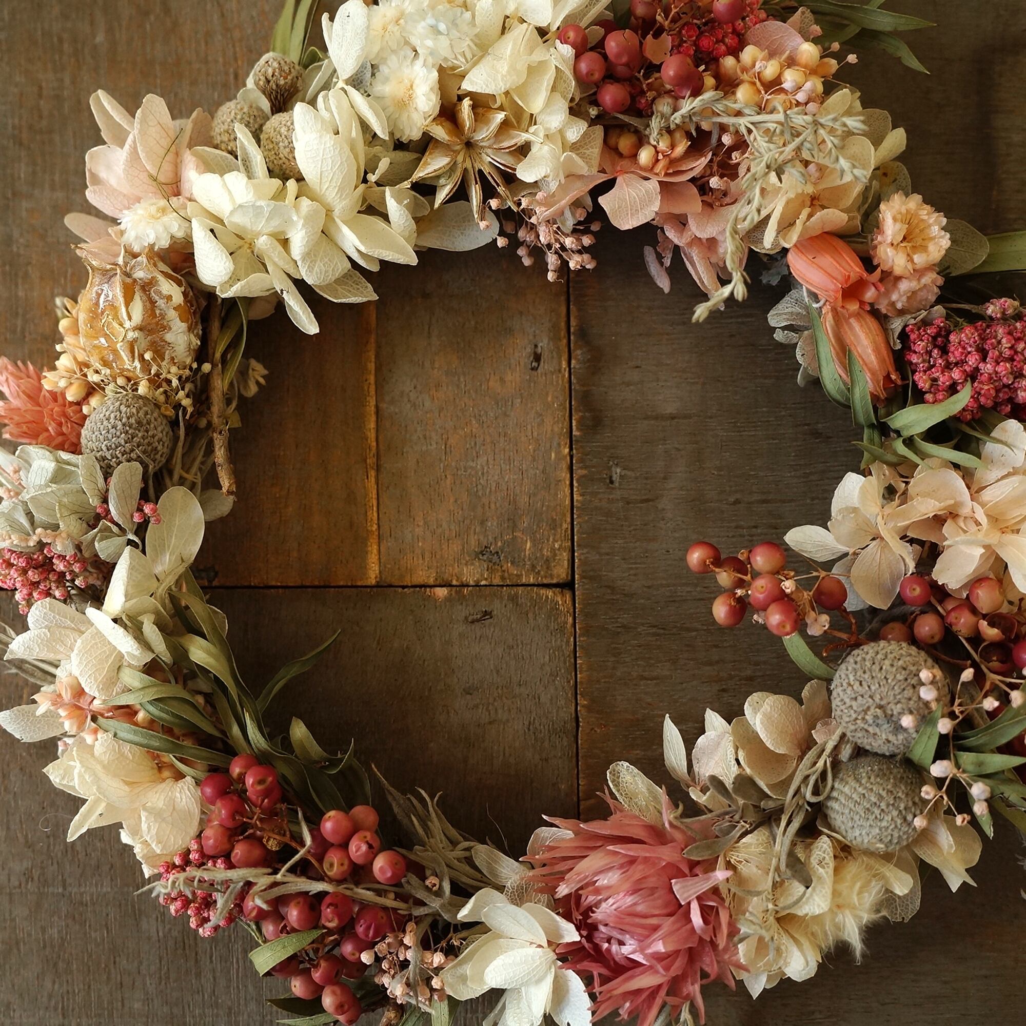 ドライフラワーとプリザーブドフラワー、木の実など本物の植物を使ったナチュラルなリースです。