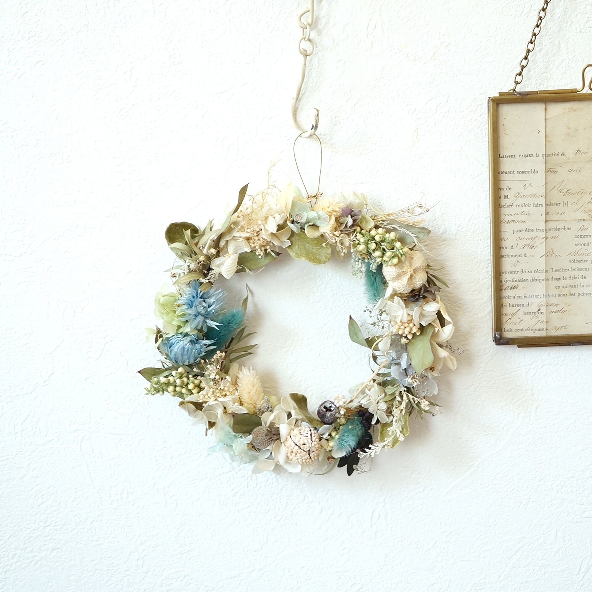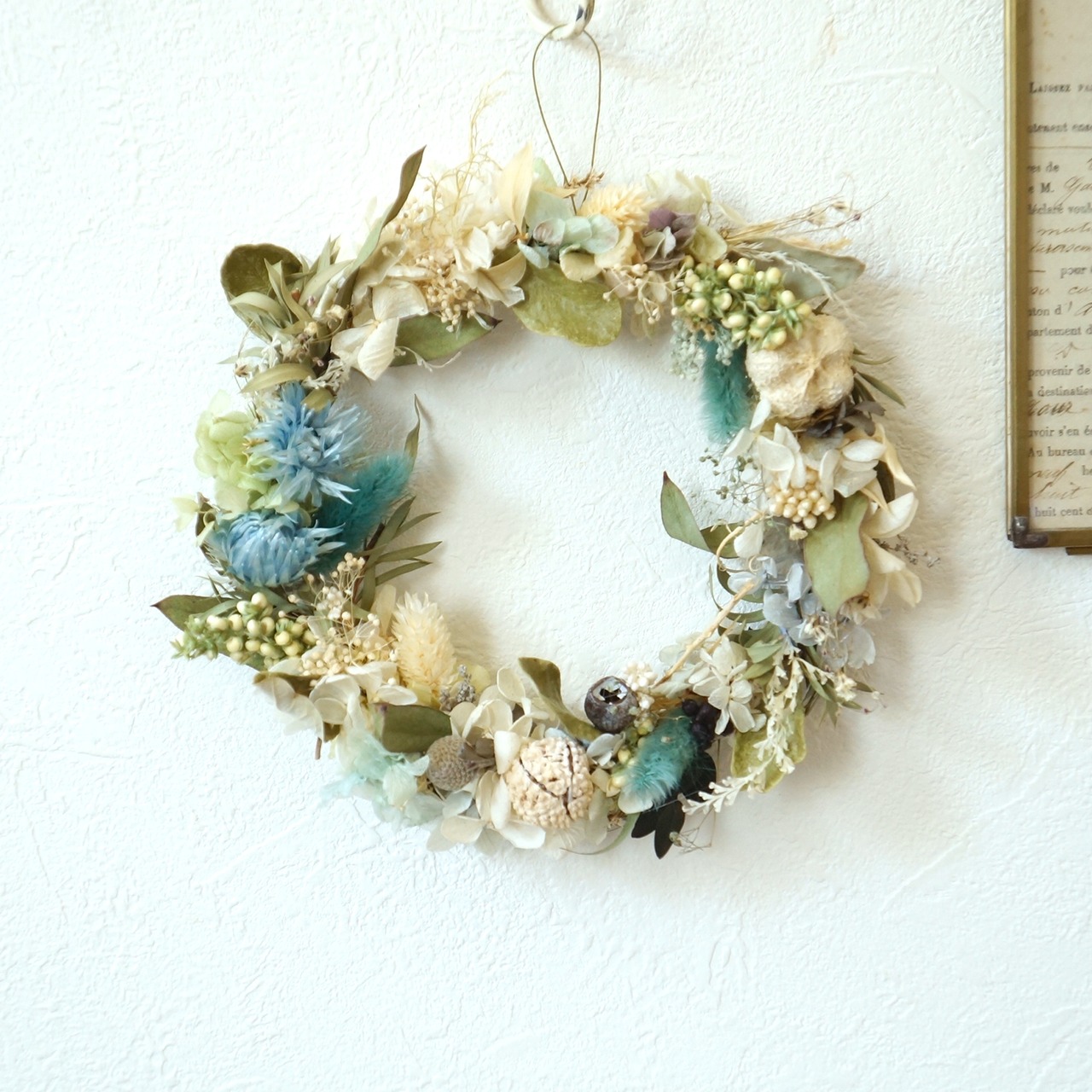 ドライフラワーとプリザーブドフラワー、木の実など本物の植物を使ったナチュラルなリースです。