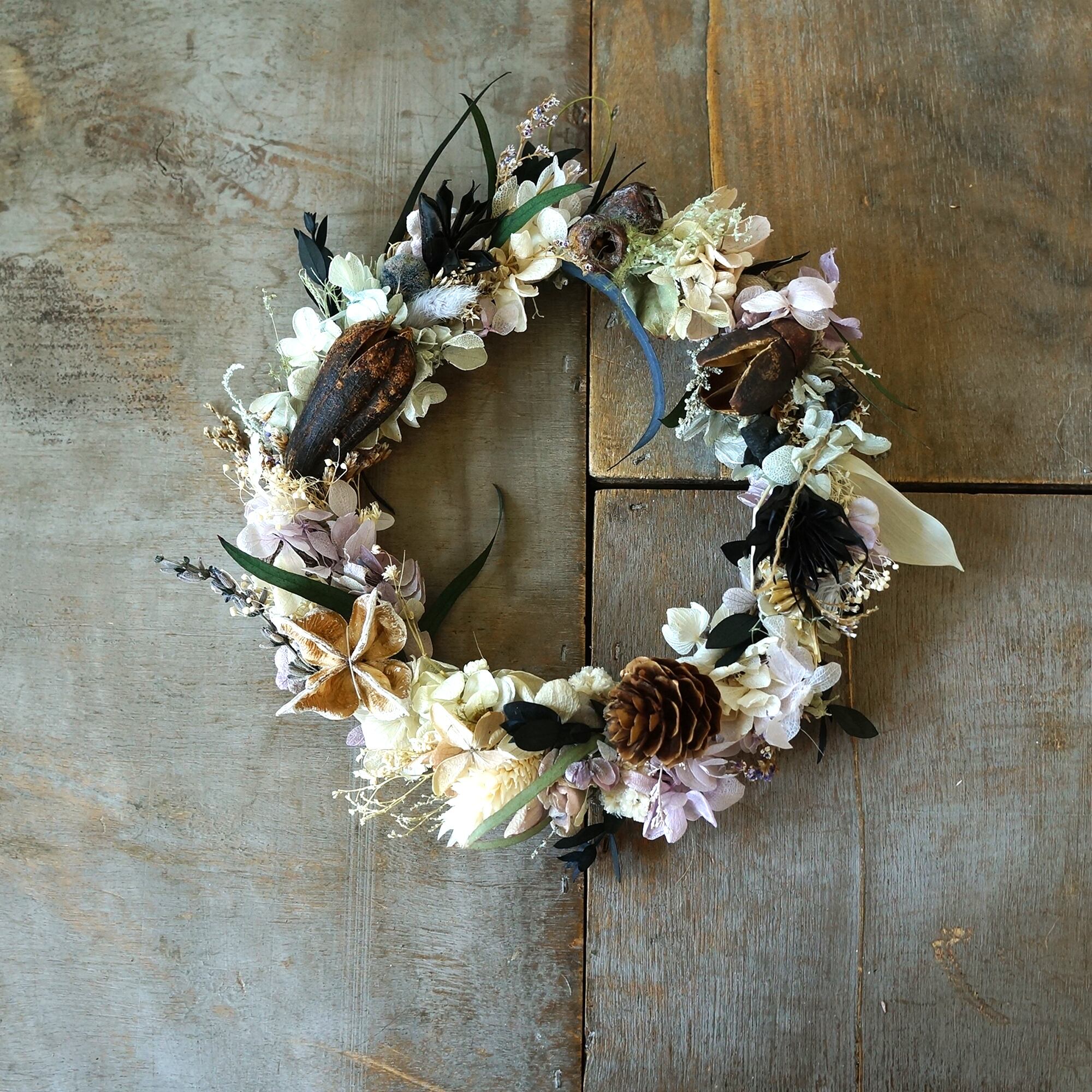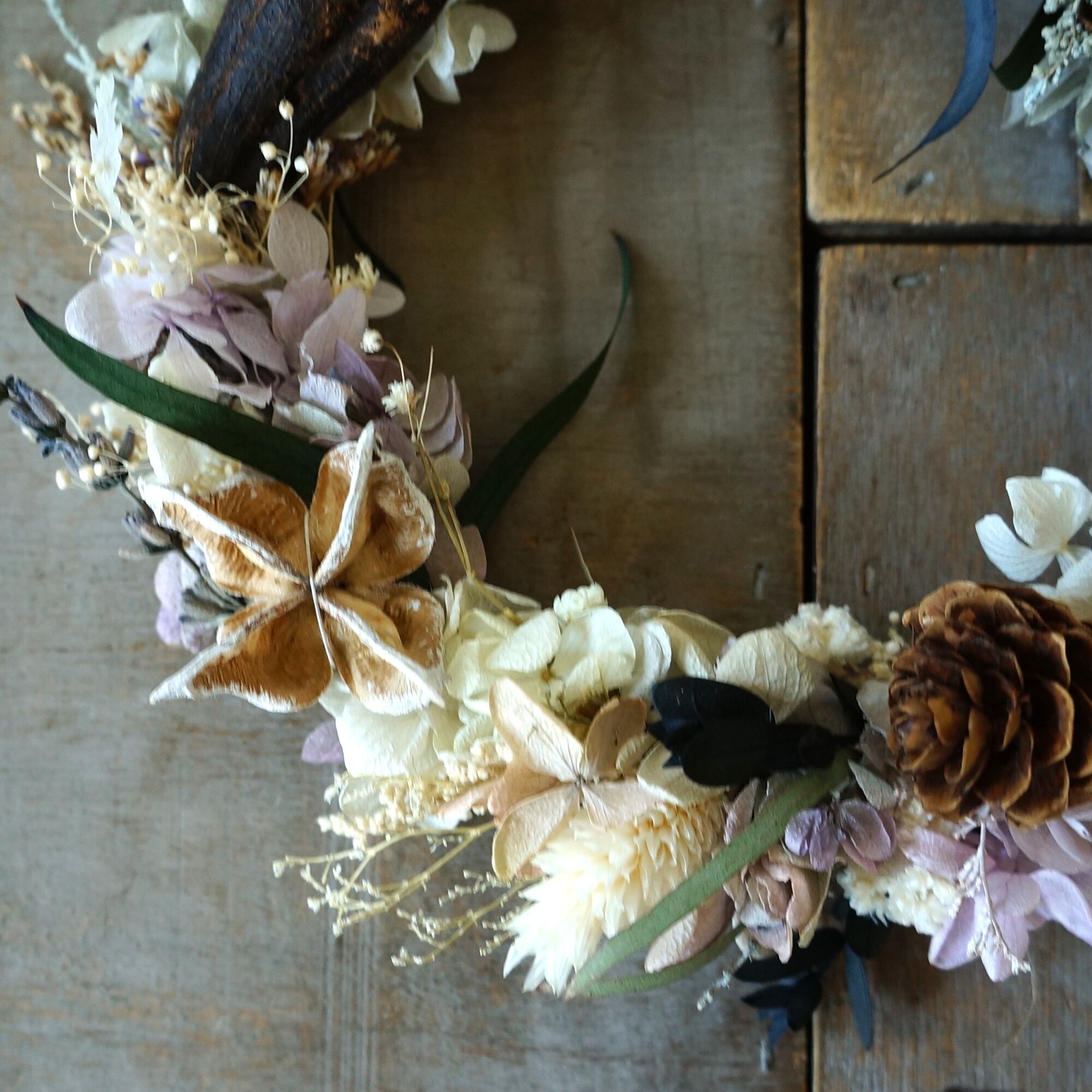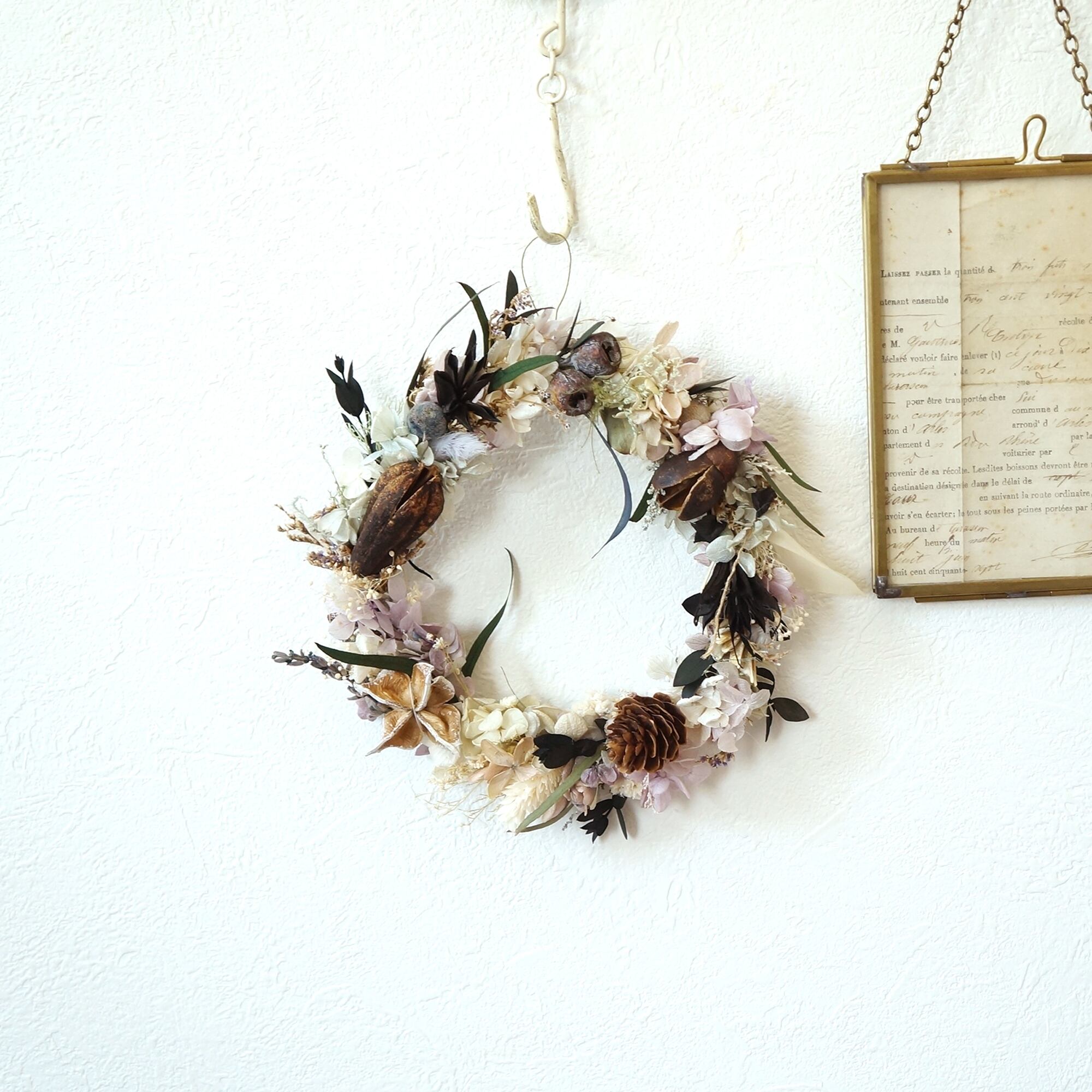 ドライフラワーとプリザーブドフラワー、木の実など本物の植物を使ったナチュラルなリースです。
