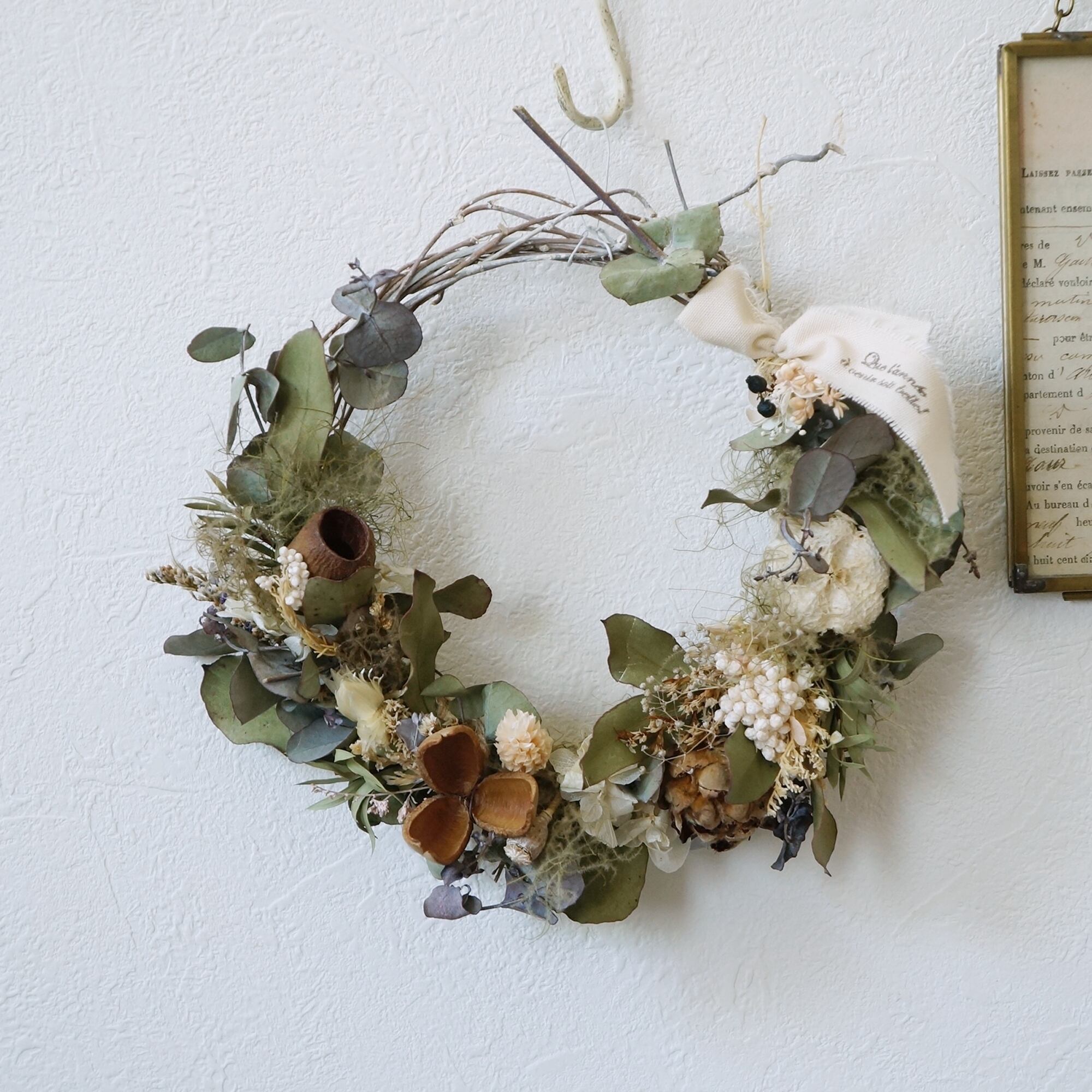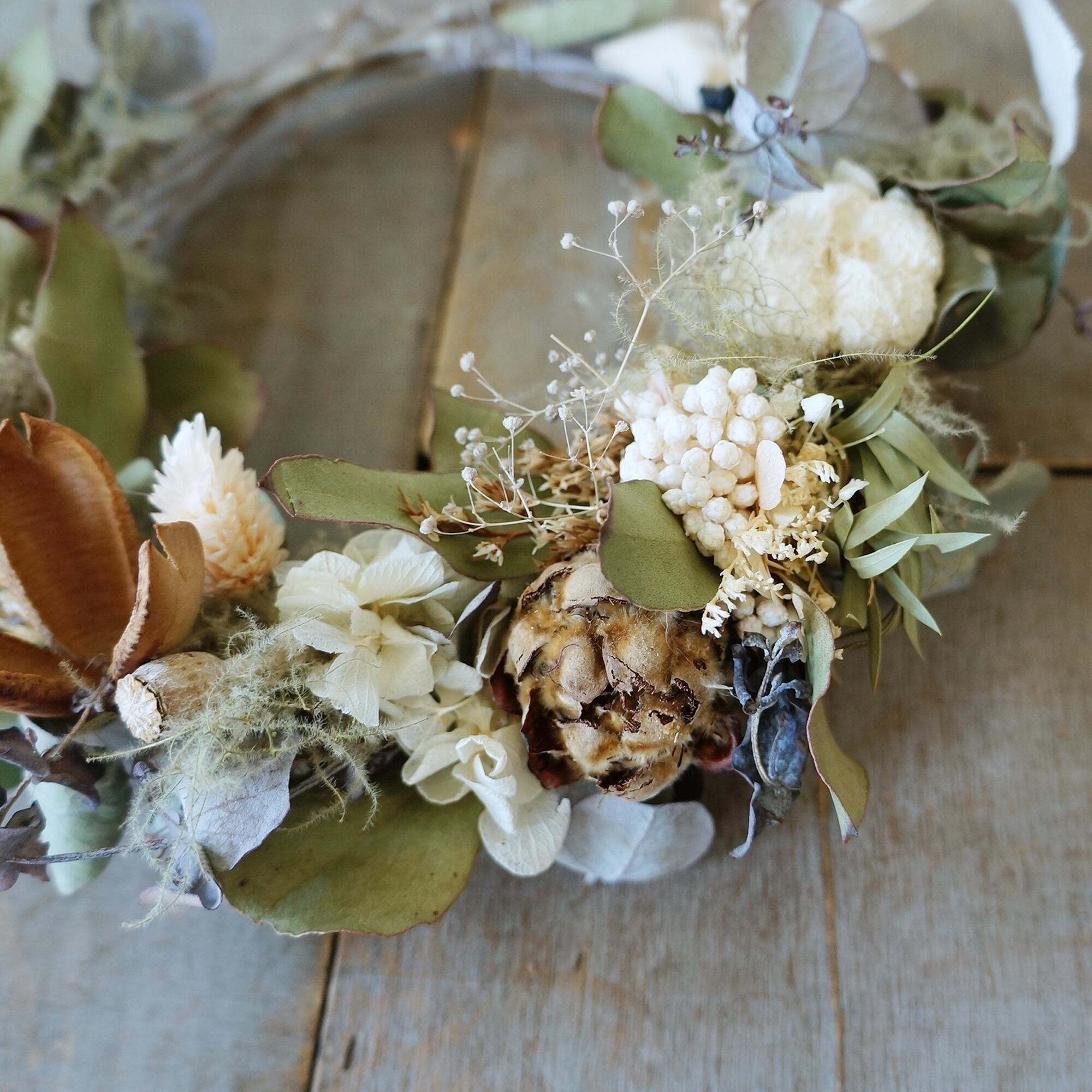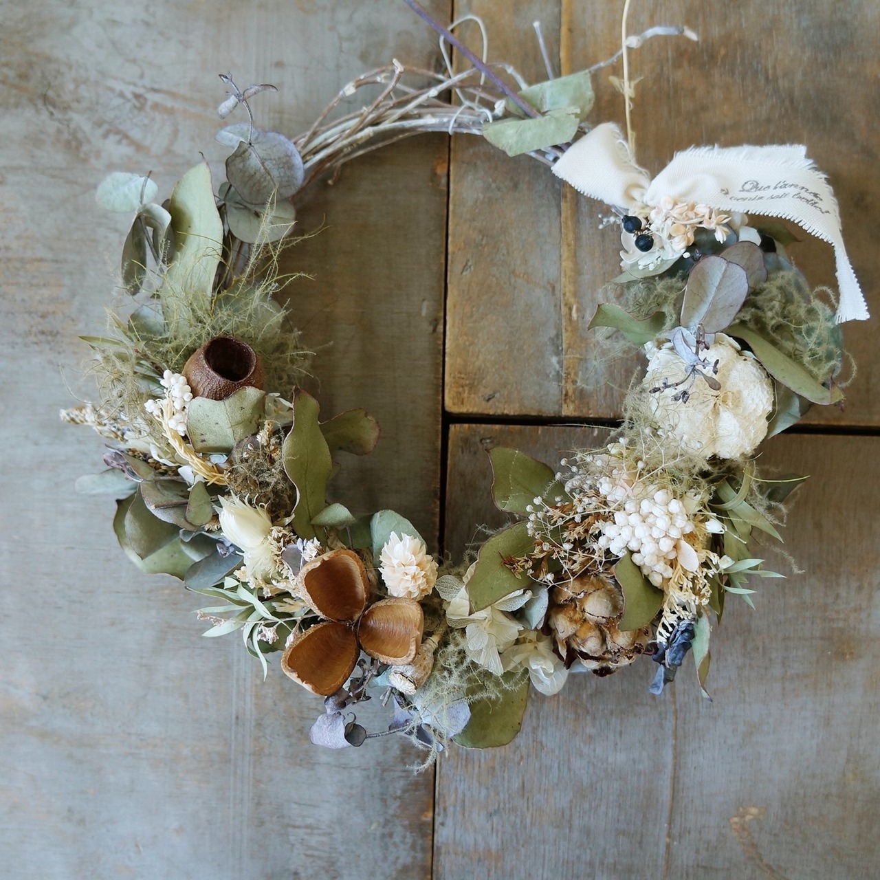 ドライフラワーとプリザーブドフラワー、木の実など本物の植物を使ったナチュラルなリースです。