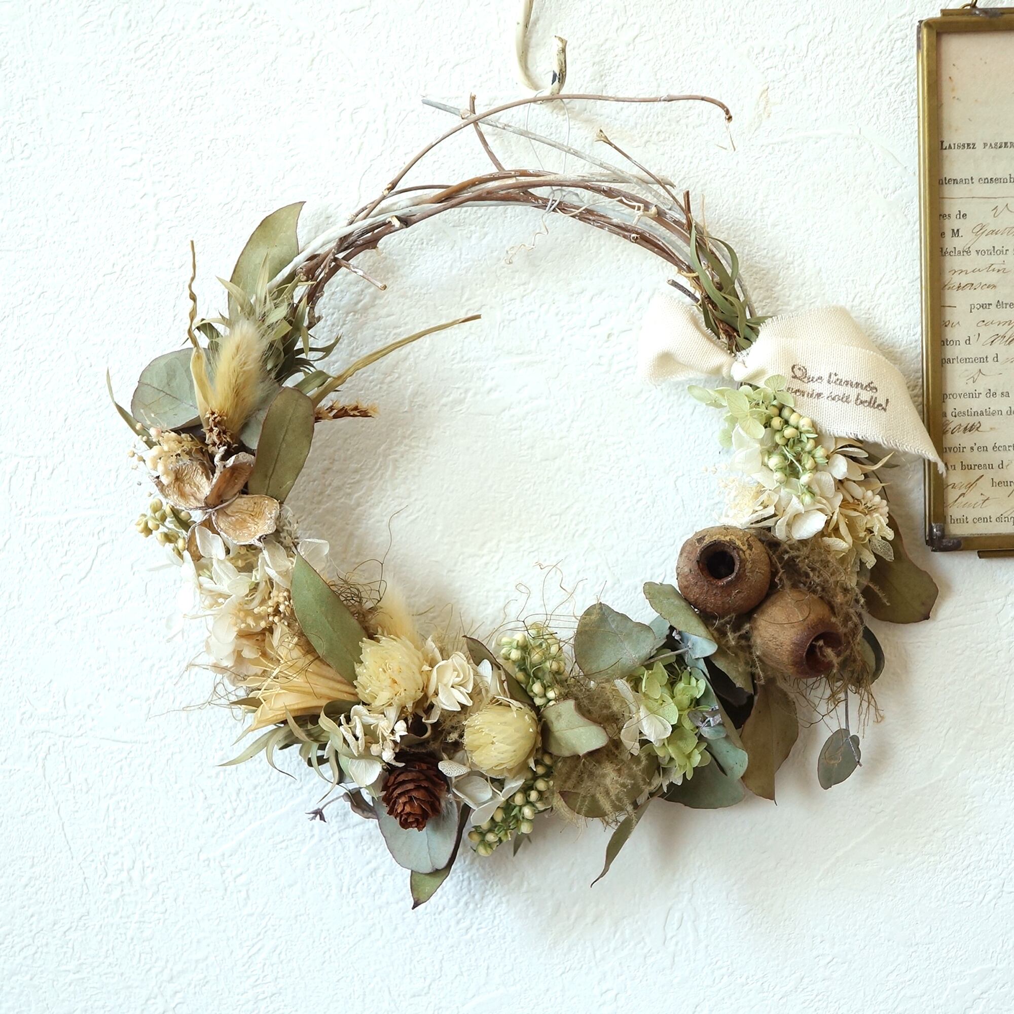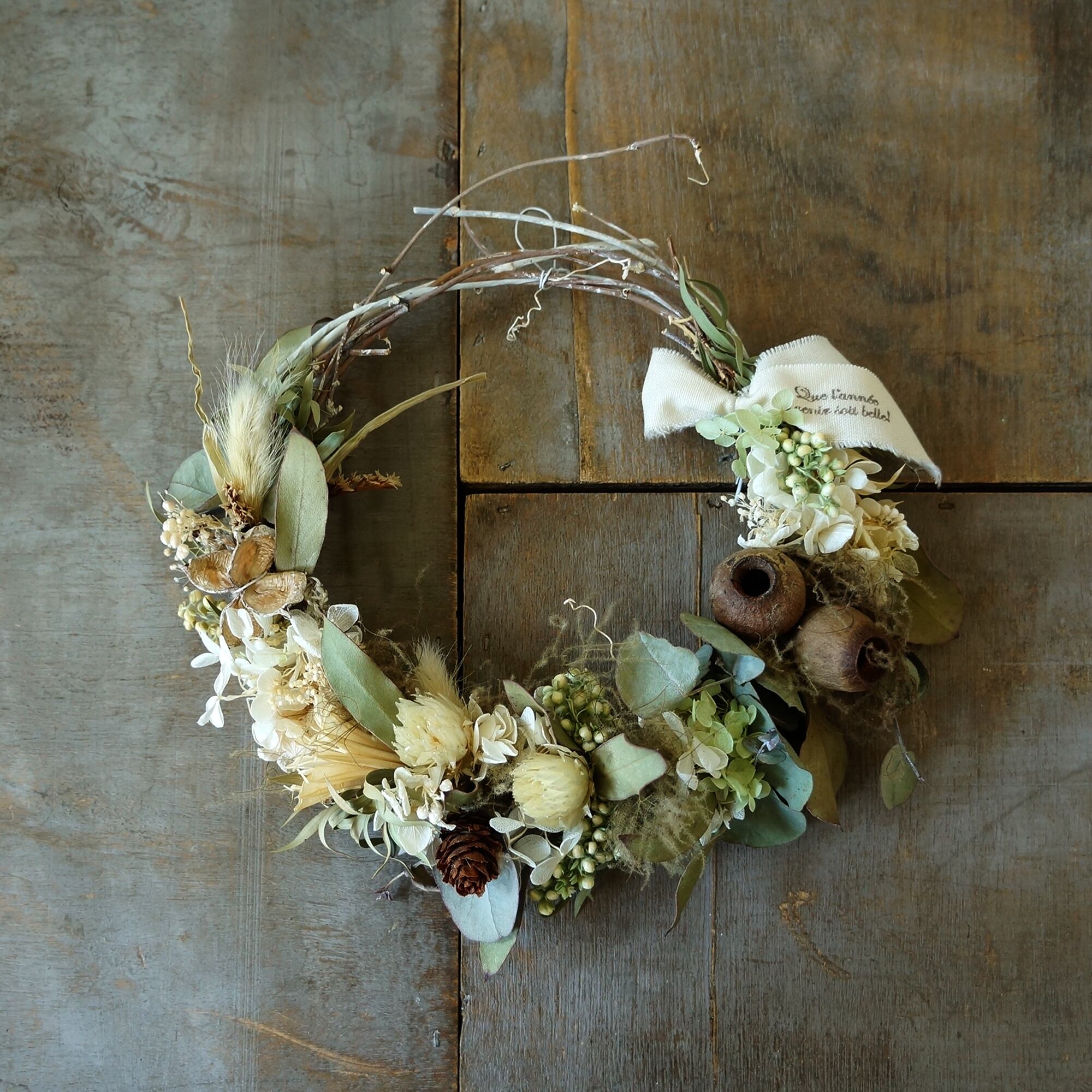 ふわふわのスモークツリーと色味が暗くなりすぎないように白い紫陽花やシルバーデイジーを合わせました。白い枝とドライの植物、木の実など自然の恵みを感じられるリースです。