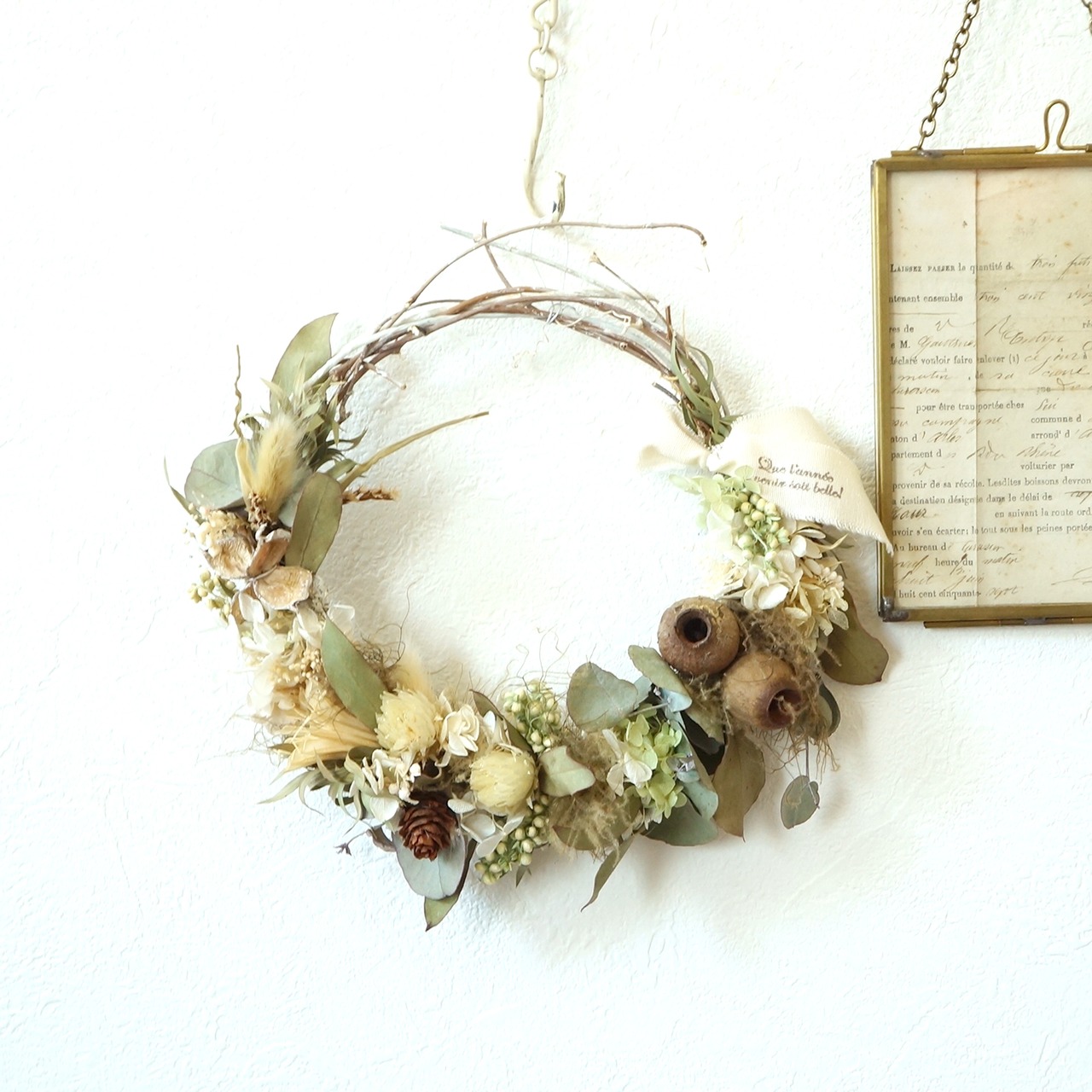 ドライの葉がかわいいのでそれをメインに制作しました。