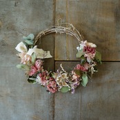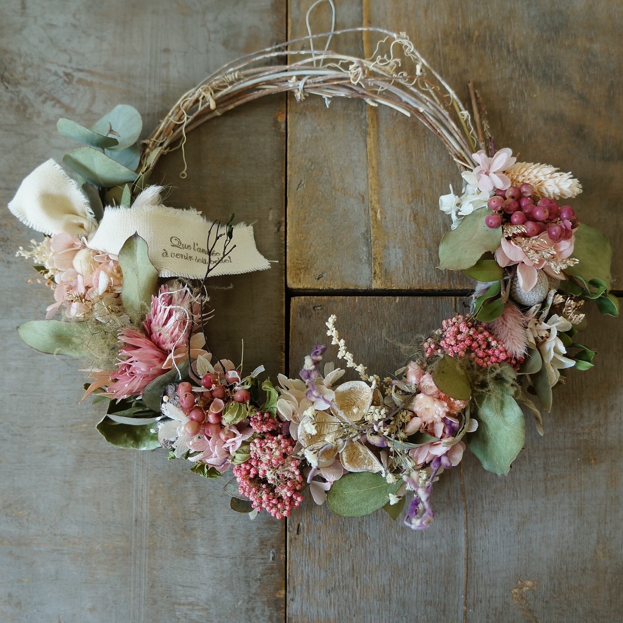 ドライフラワーとプリザーブドフラワー、木の実など本物の植物を使ったナチュラルなリースです。