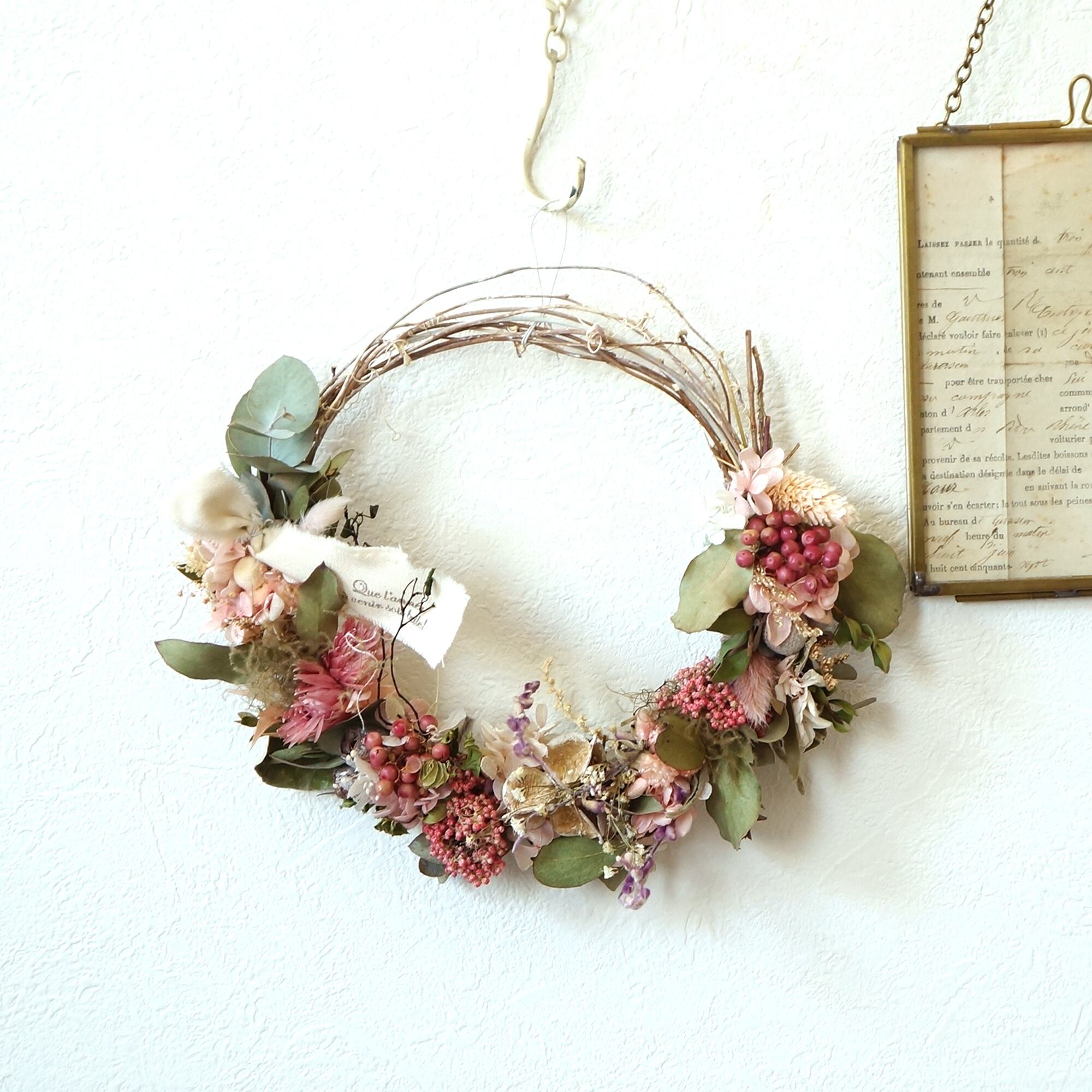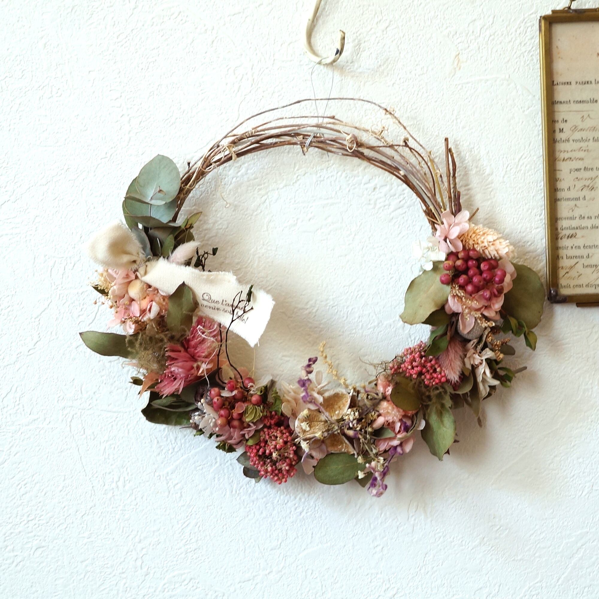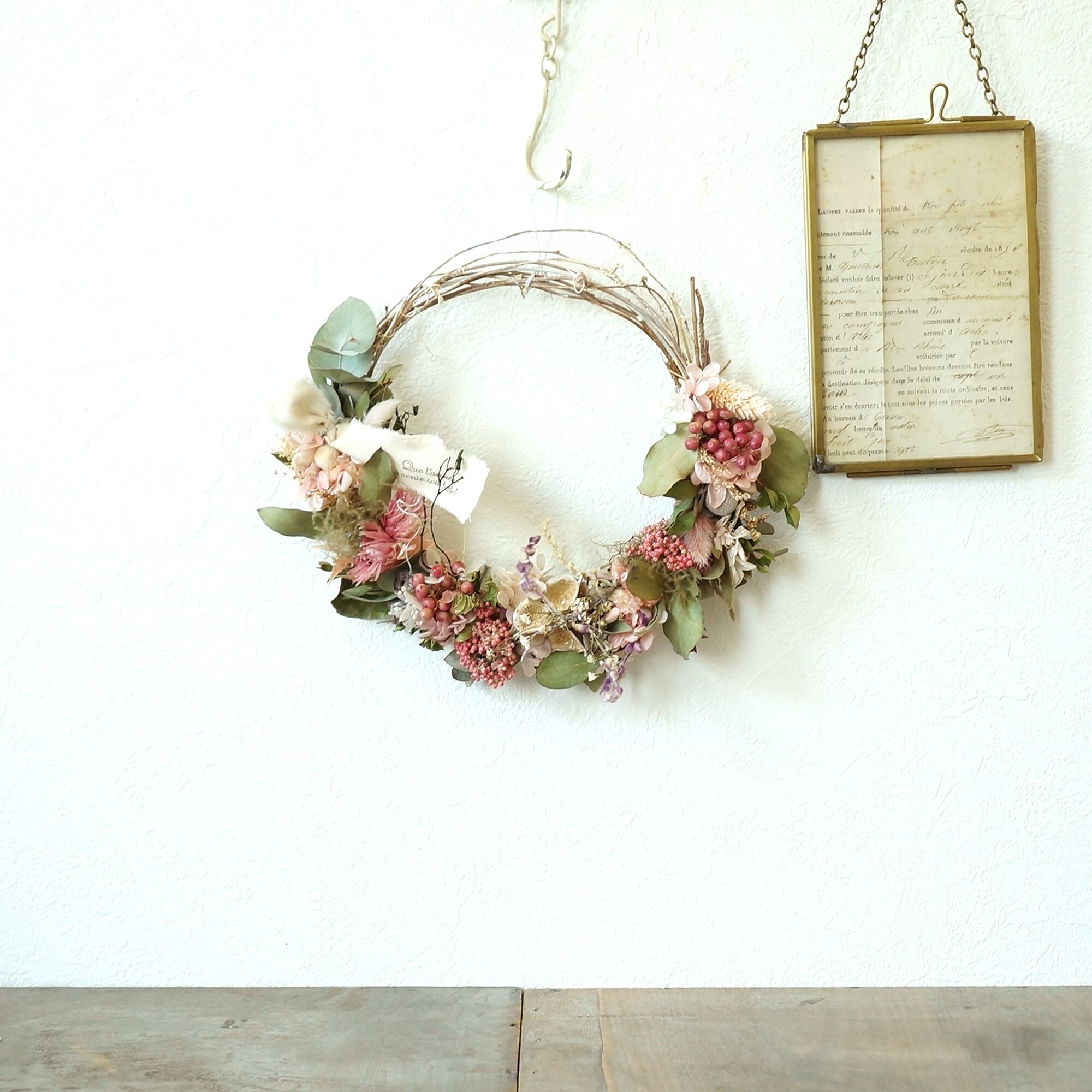大きめのユーカリの葉とピンクの植物を合わせた可愛らしいリースです。