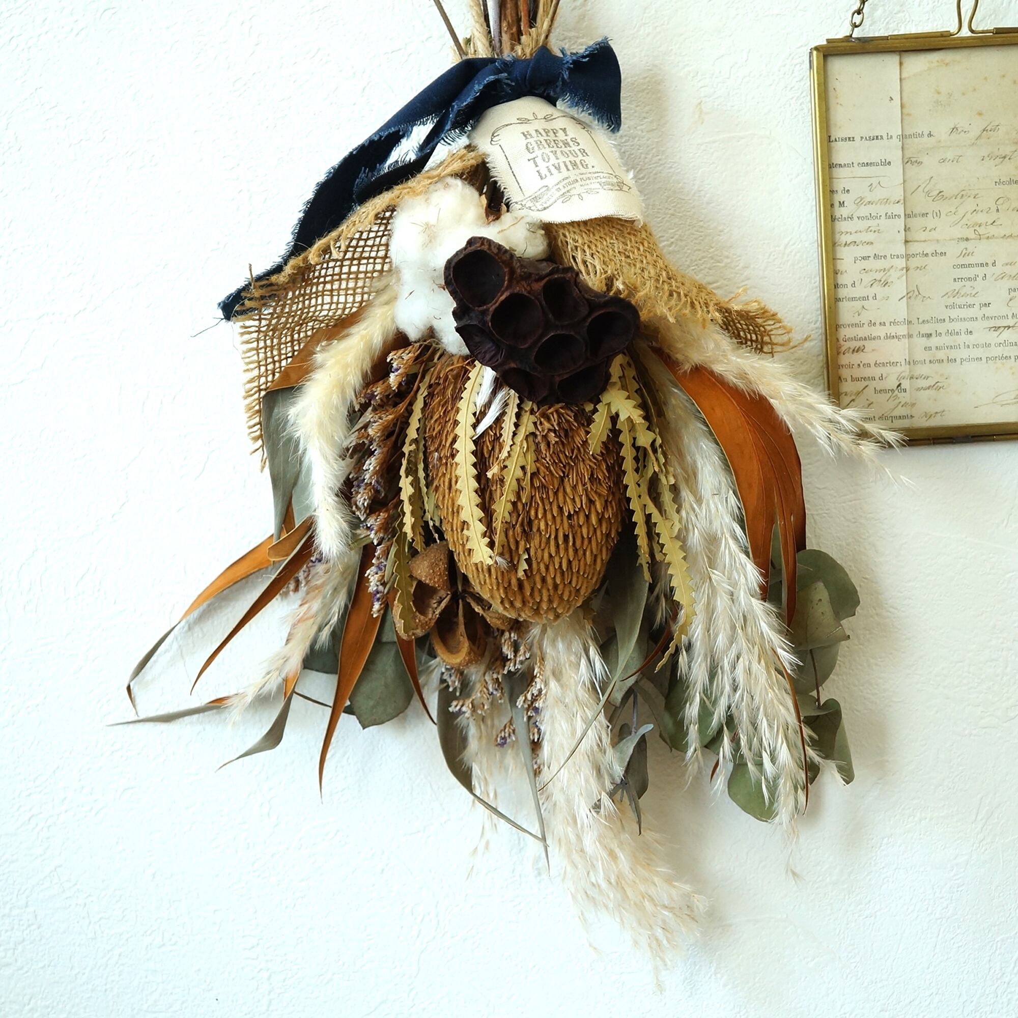 ユーカリやグレビレアなどをベースにドライの植物を合わせたスワッグです。