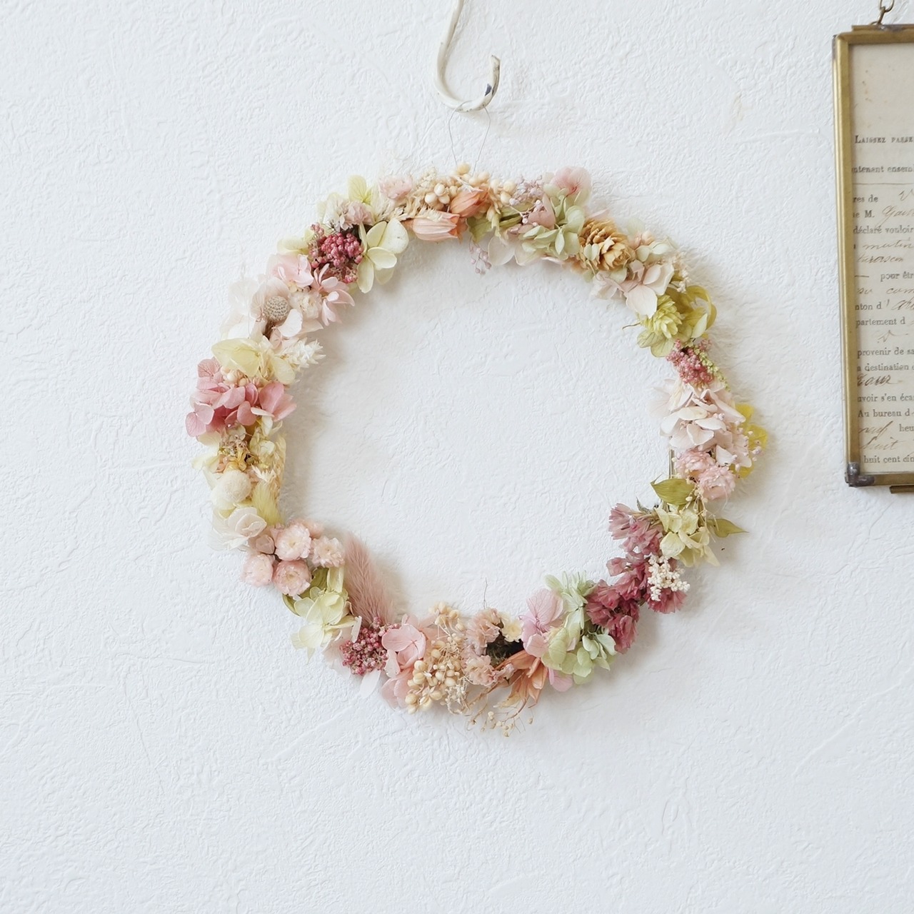ドライフラワーとプリザーブドフラワー、木の実など本物の植物を使ったナチュラルなリースです。