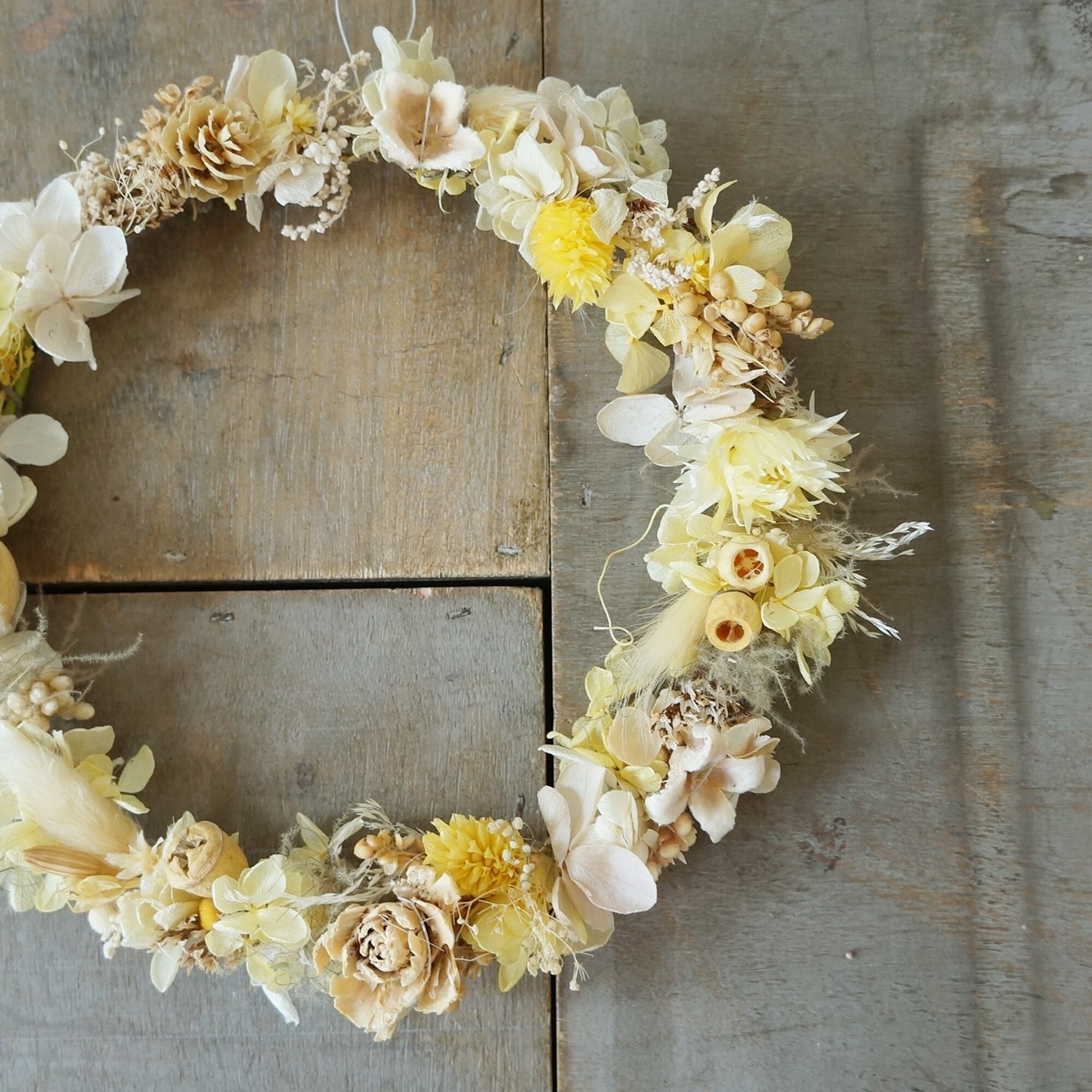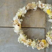 ドライフラワーとプリザーブドフラワー、木の実など本物の植物を使ったナチュラルなリースです。