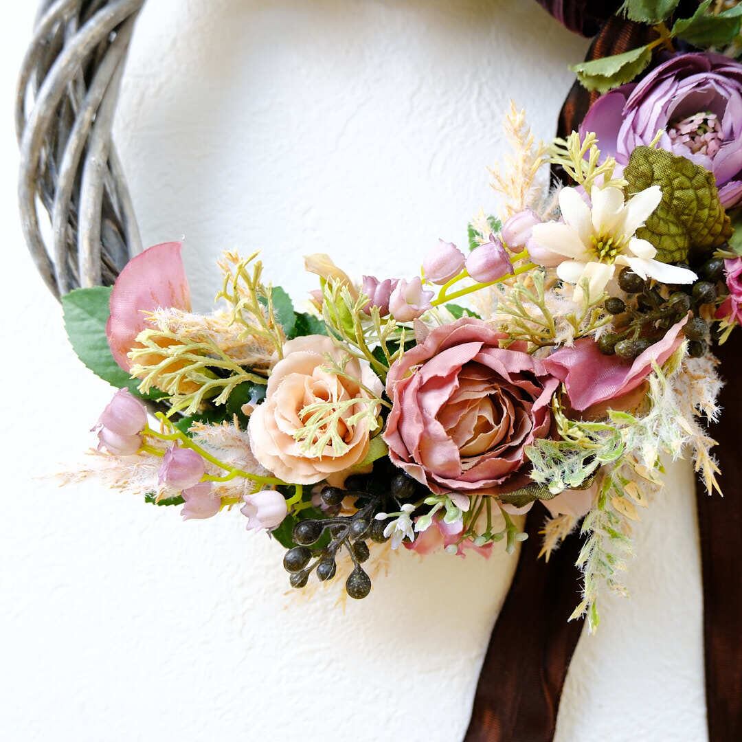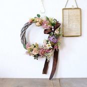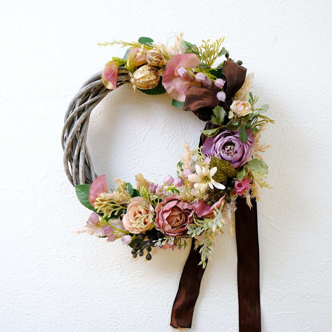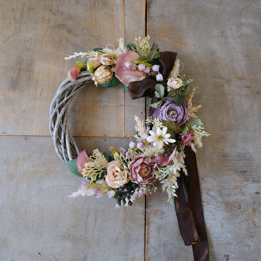 上品なモーブ系のアーティフィシャルフラワー(造花に比べてより本物に近い色や形を再現したもの)のリースです。