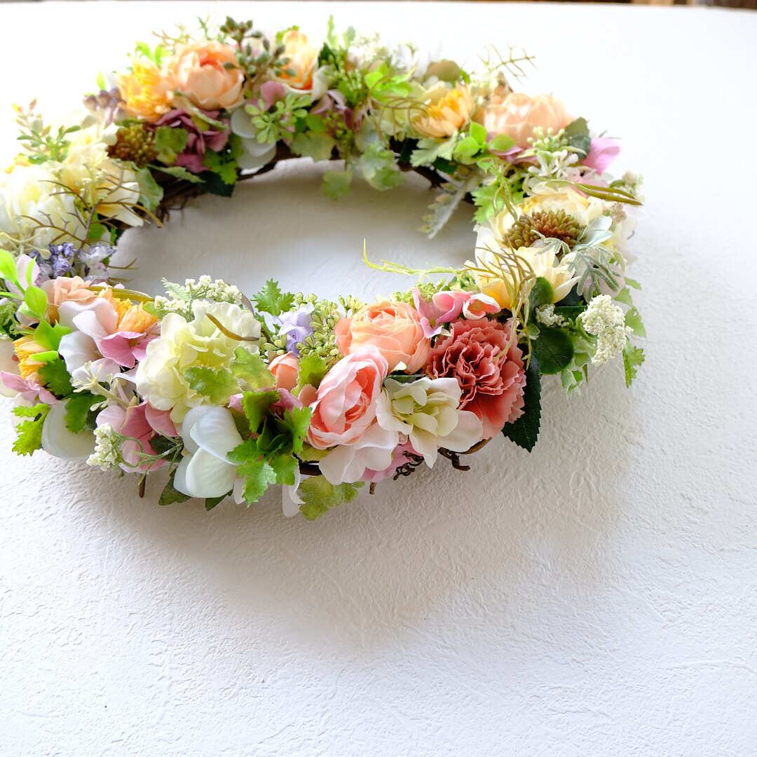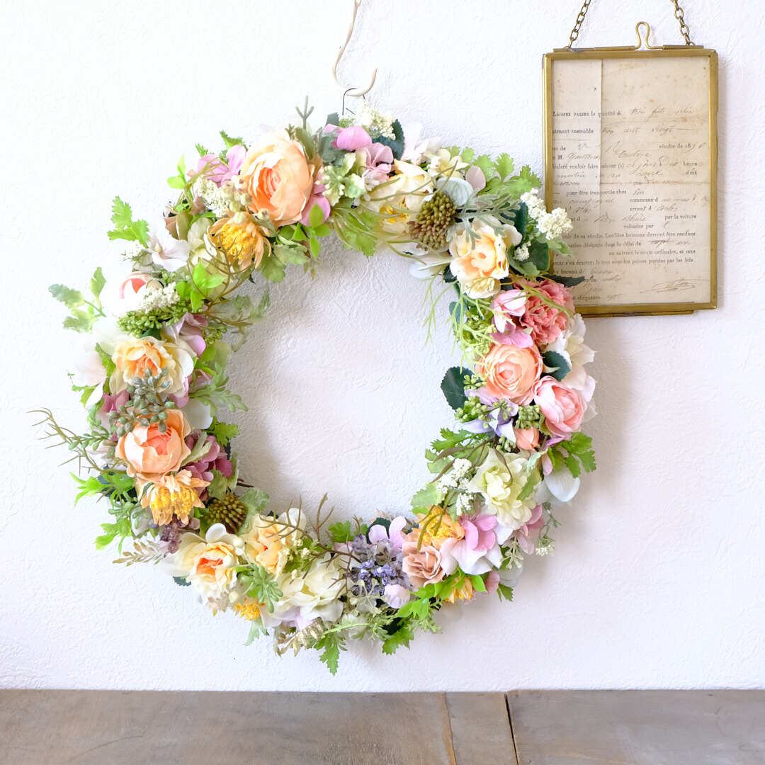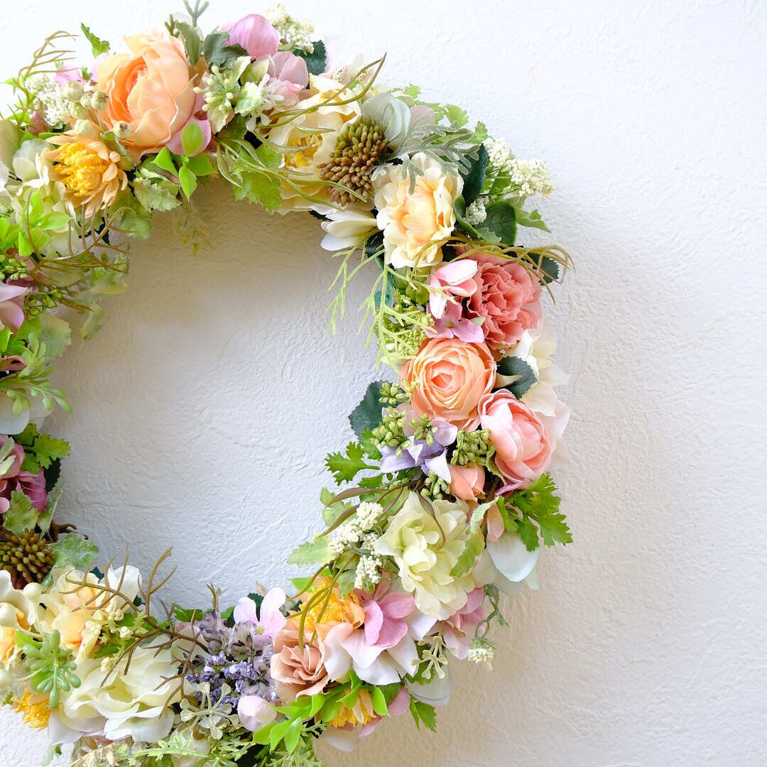グリーンが多めのアレンジメントのようなアーティフィシャルフラワー(造花に比べてより本物に近い色や形を再現したもの)のリースです。
