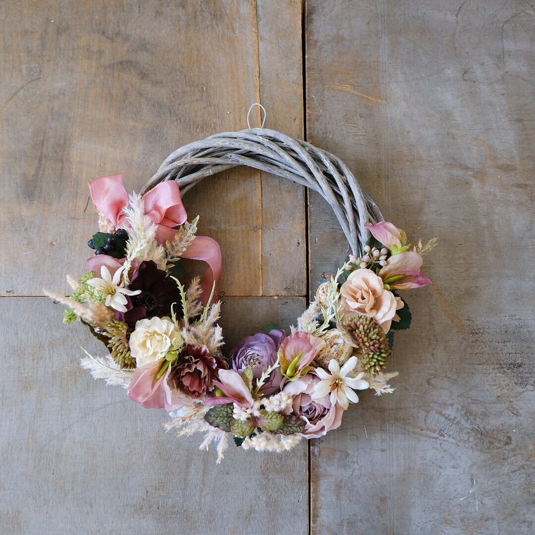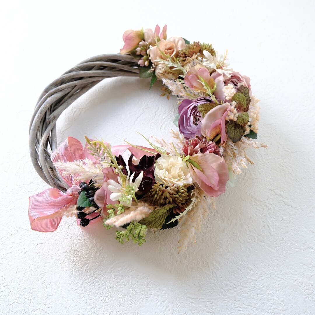 ピンクとベージュカラーに渋めのグリーンを合わせた可愛らしい秋物リース。
