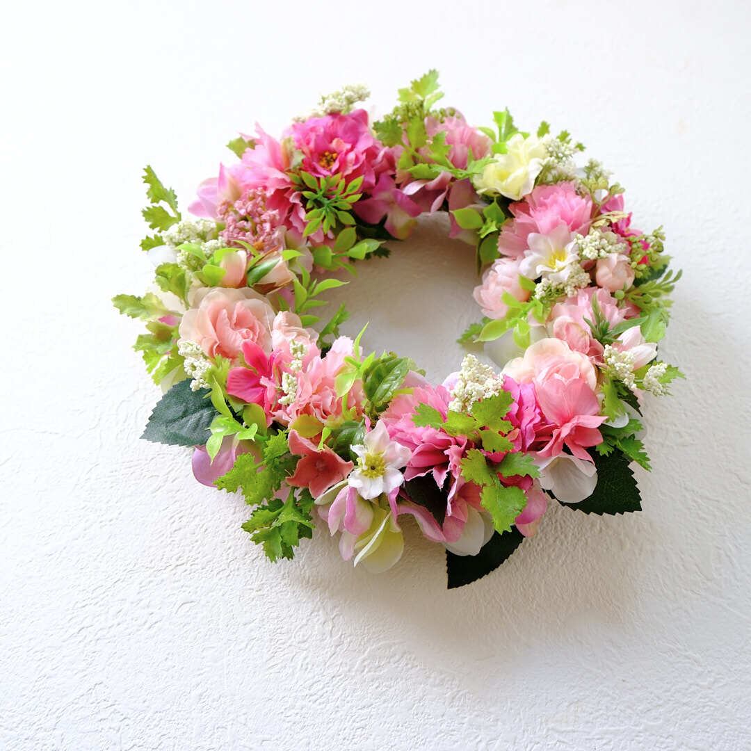 ピンクのバラとカーネーションのアーティフィシャルフラワー(造花に比べてより本物に近い色や形を再現したもの)のリースです。