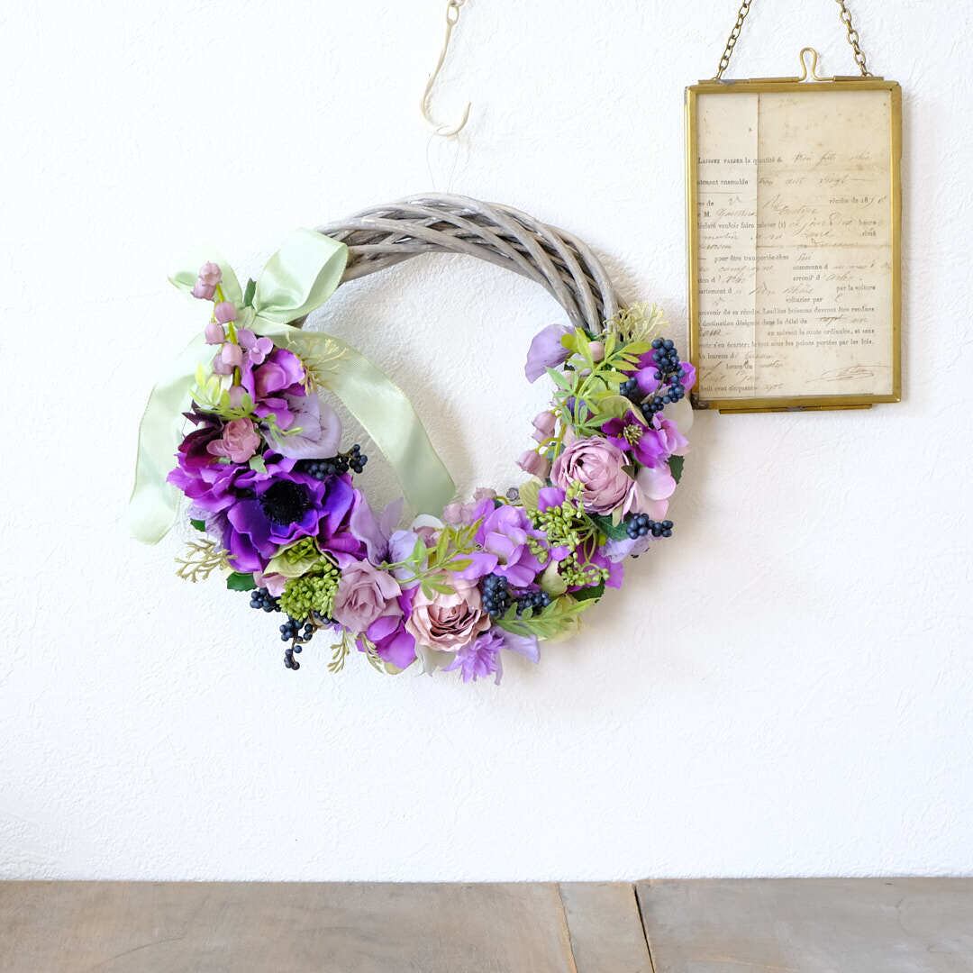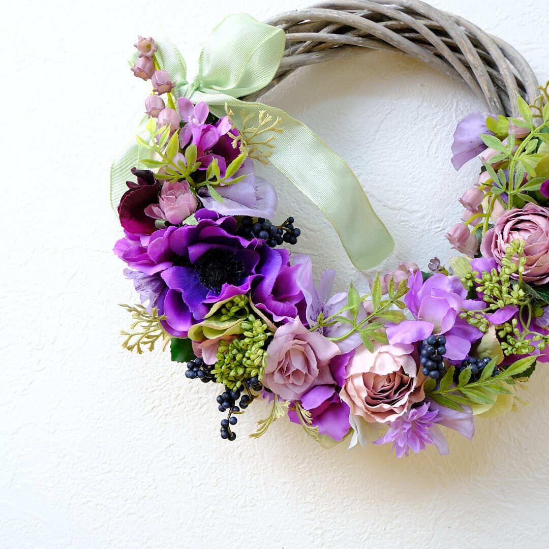 大輪のアネモネやコロンと丸いバラ、波打つ花弁が美しいデルフィニュームなど紫色の植物をふんだんに使ったリースです。