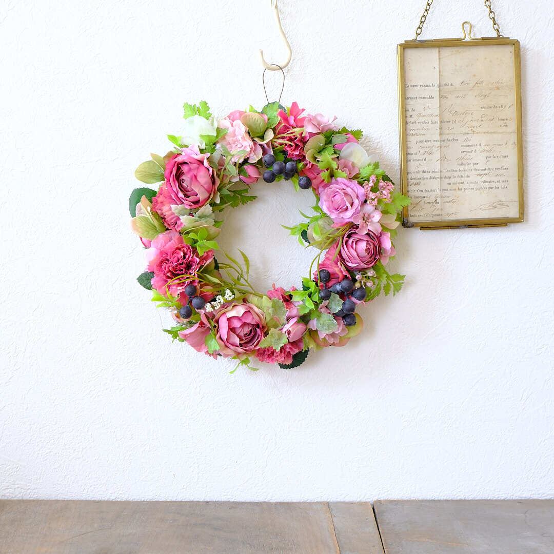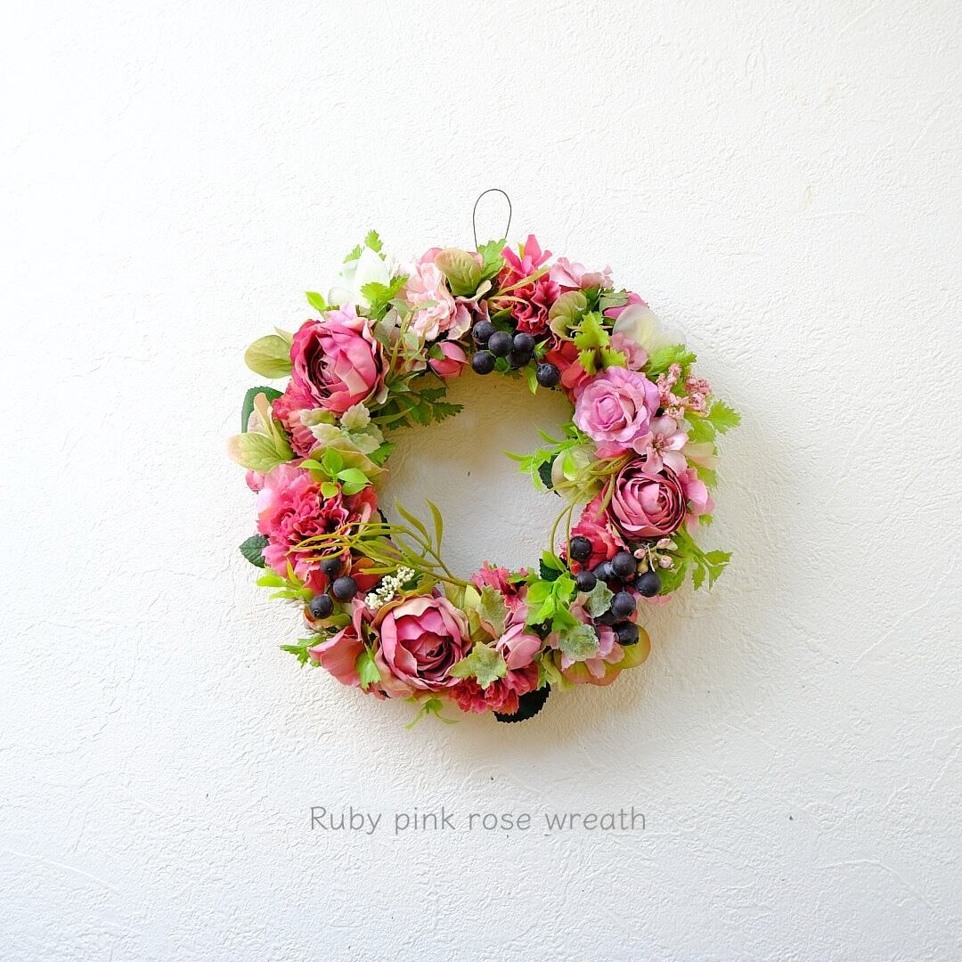 ルビーピンクのころんとしたカップ咲きのバラ、マゼンダ色のカーネーションやバラを入れた大人可愛いピンクのリース。