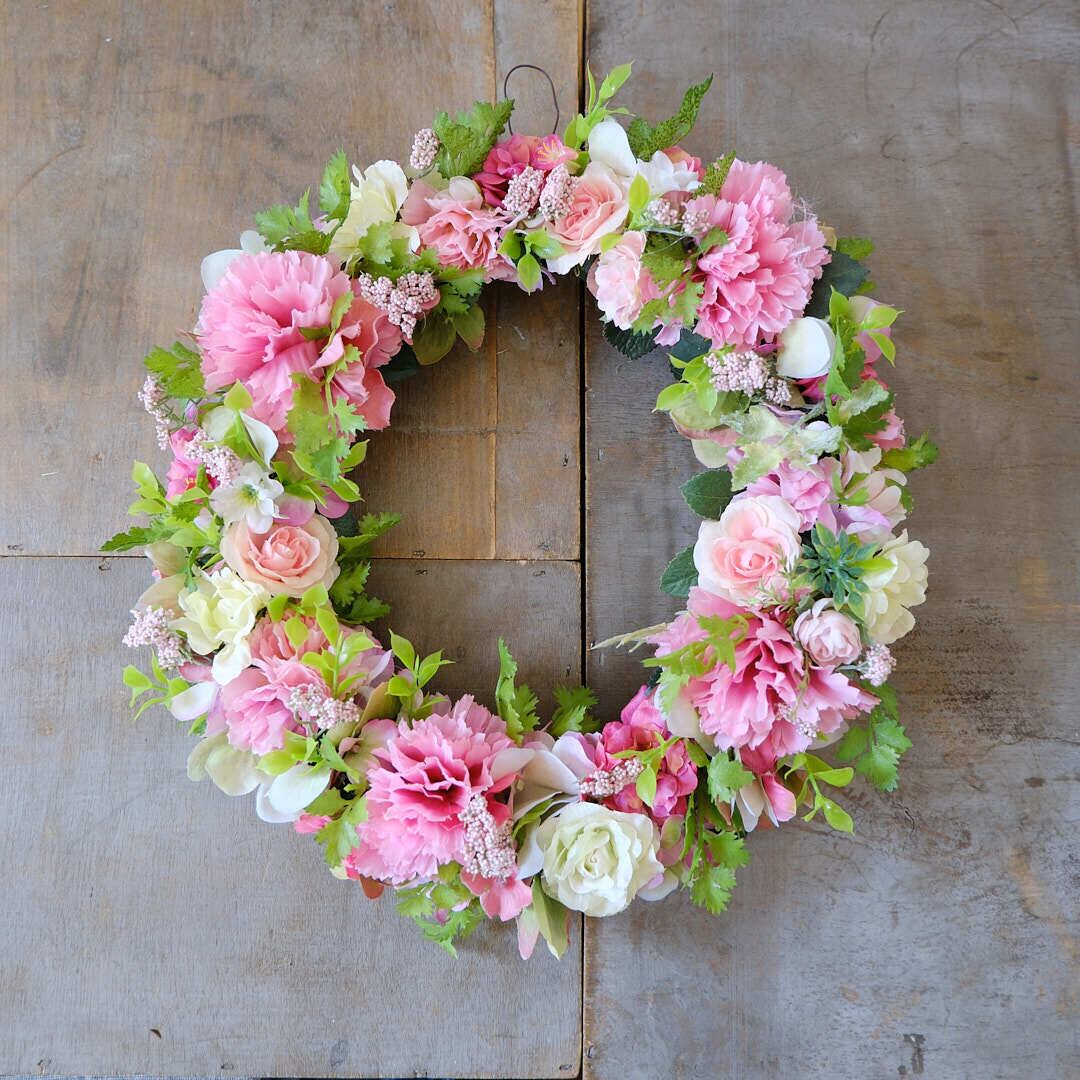 ピンクのカーネーションのアーティフィシャルフラワー(造花に比べてより本物に近い色や形を再現したもの)のリースです。