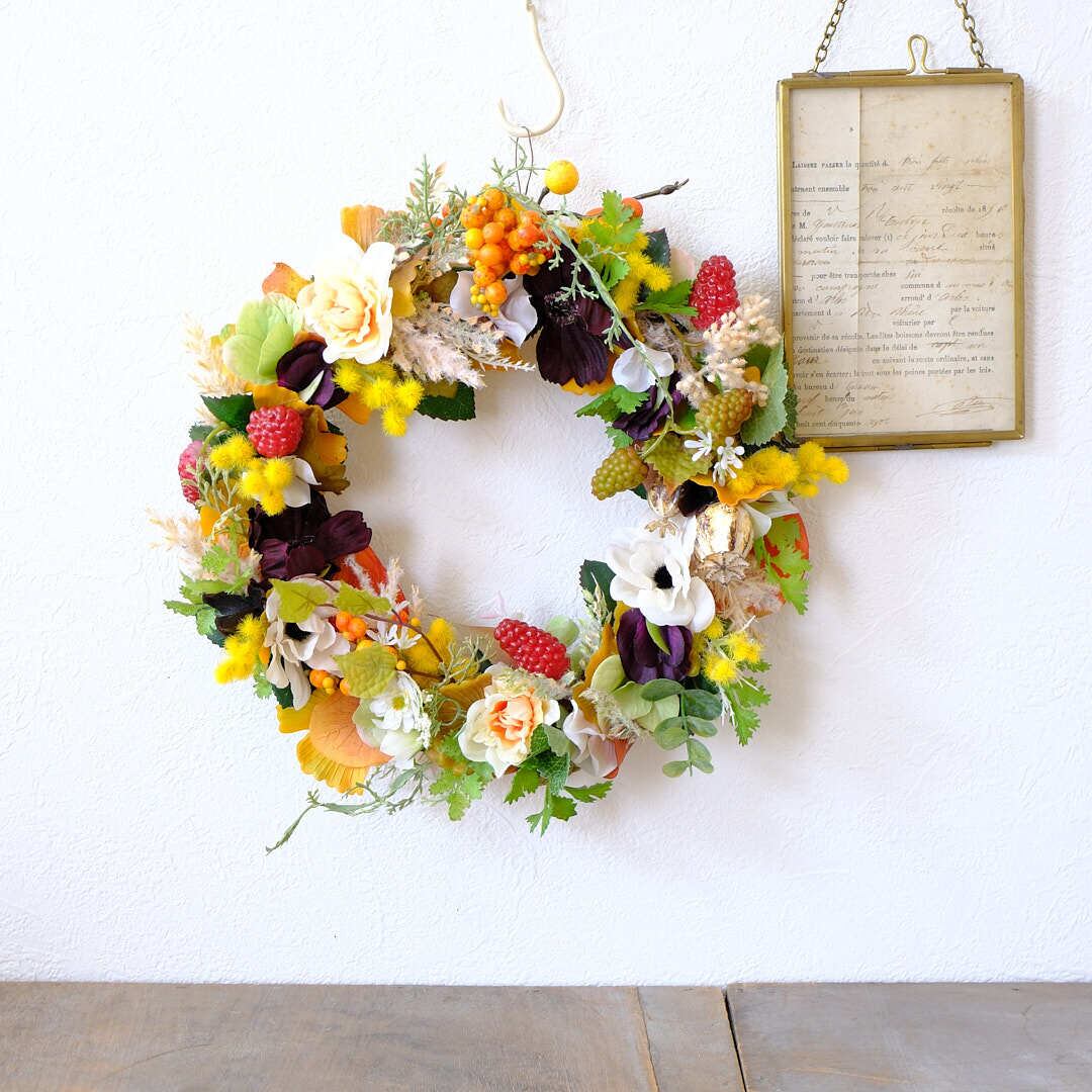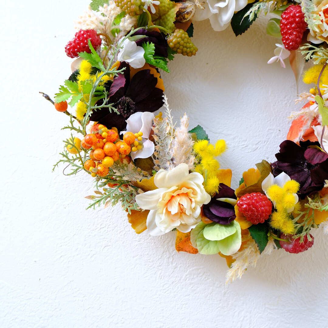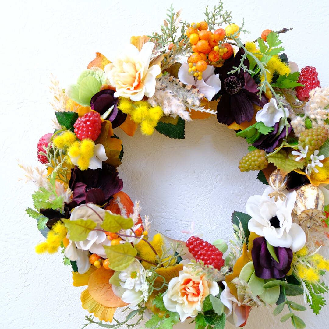 実りの秋に相応しくベリーの入ったのアーティフィシャルフラワー(造花に比べてより本物に近い色や形を再現したもの)のリースです。