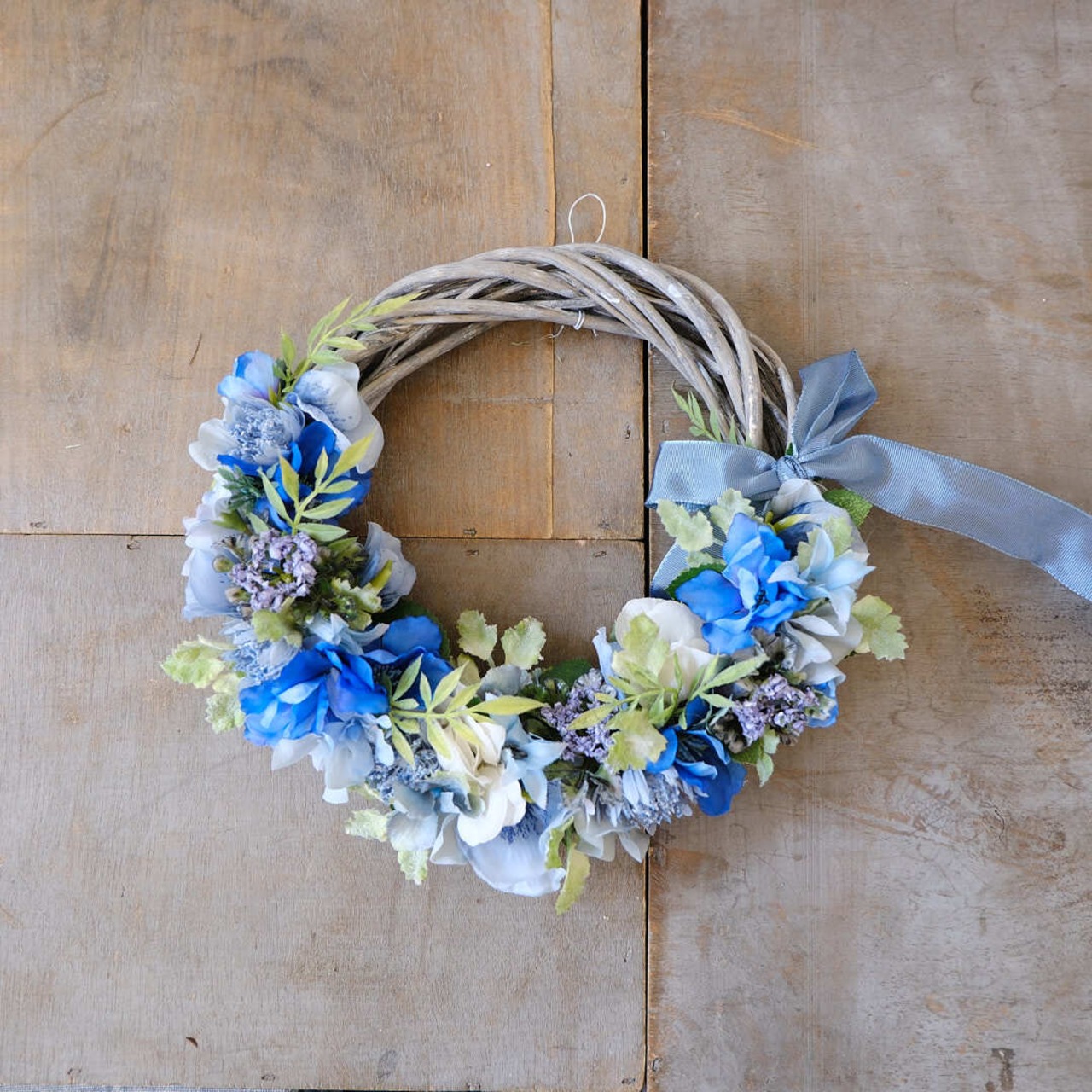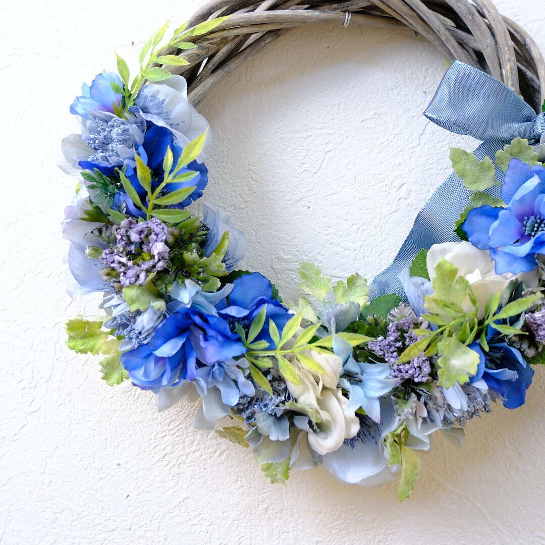 ブルーとグリーンのアーティフィシャルフラワー(造花に比べてより本物に近い色や形を再現したもの)のリースです。
