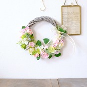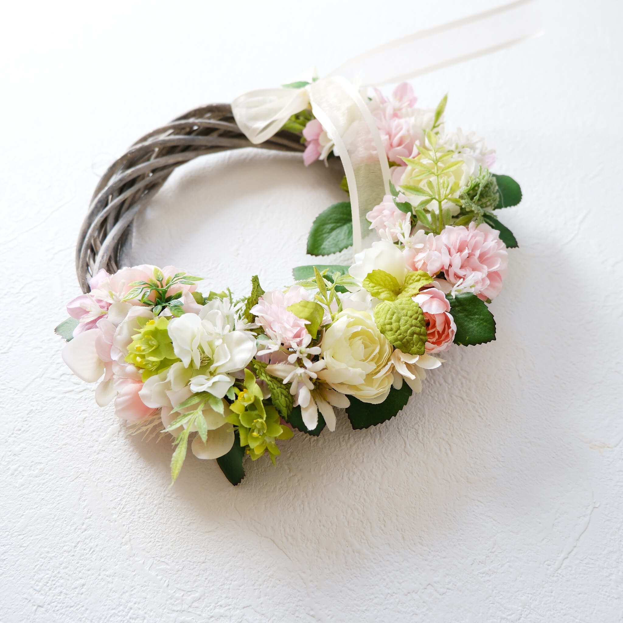 ピンクと白のバラがかわいいアーティフィシャルフラワー(造花に比べてより本物に近い色や形を再現したもの)のリースです。