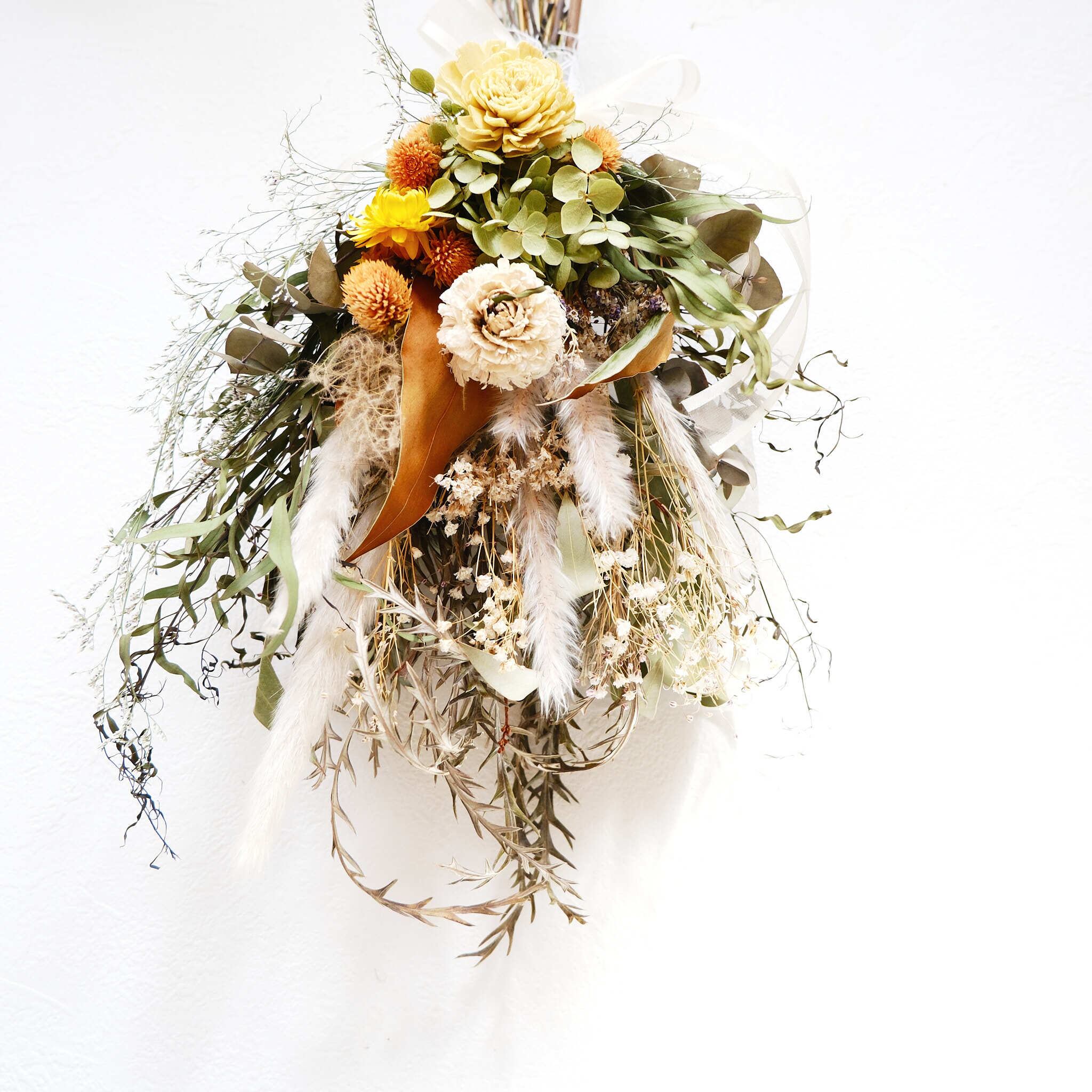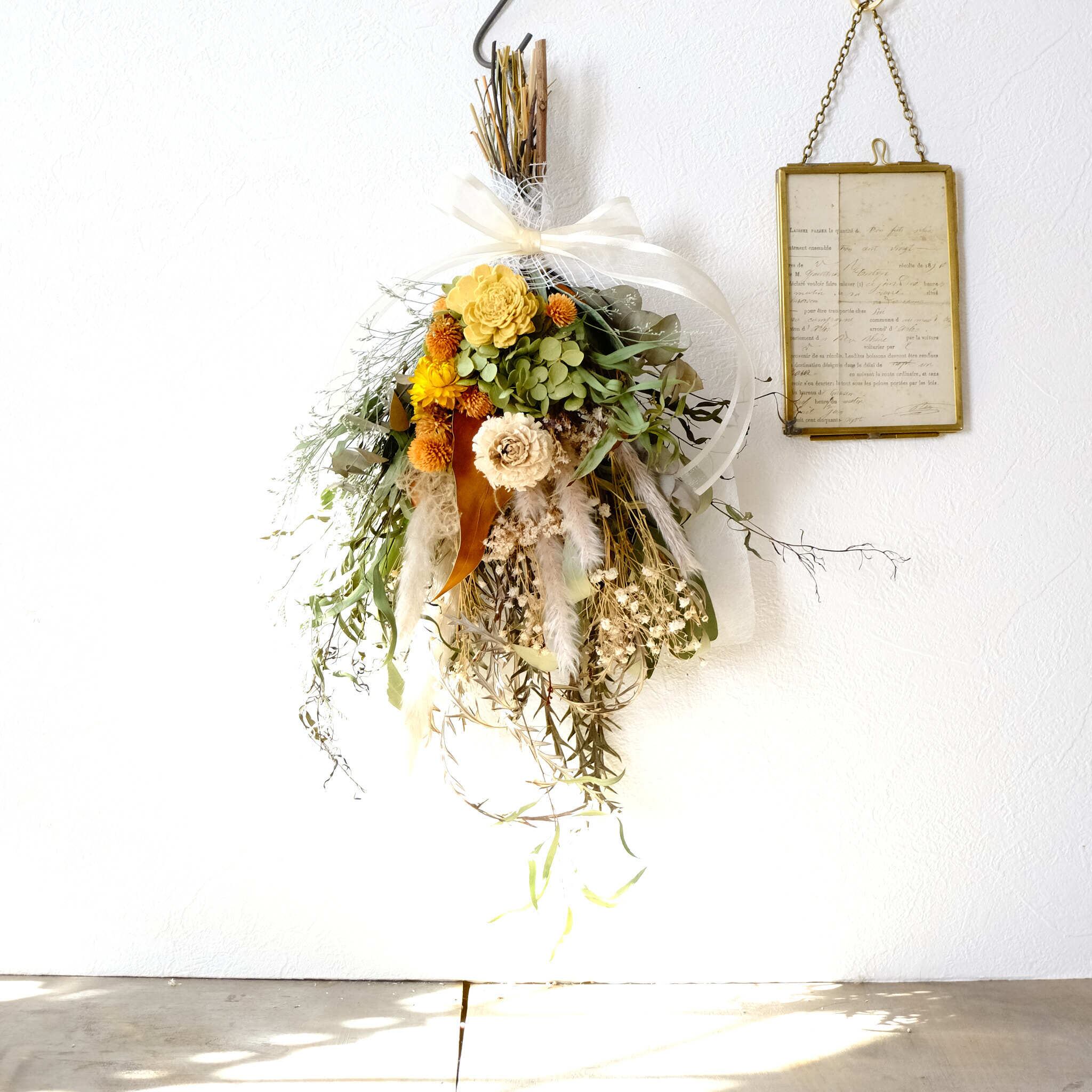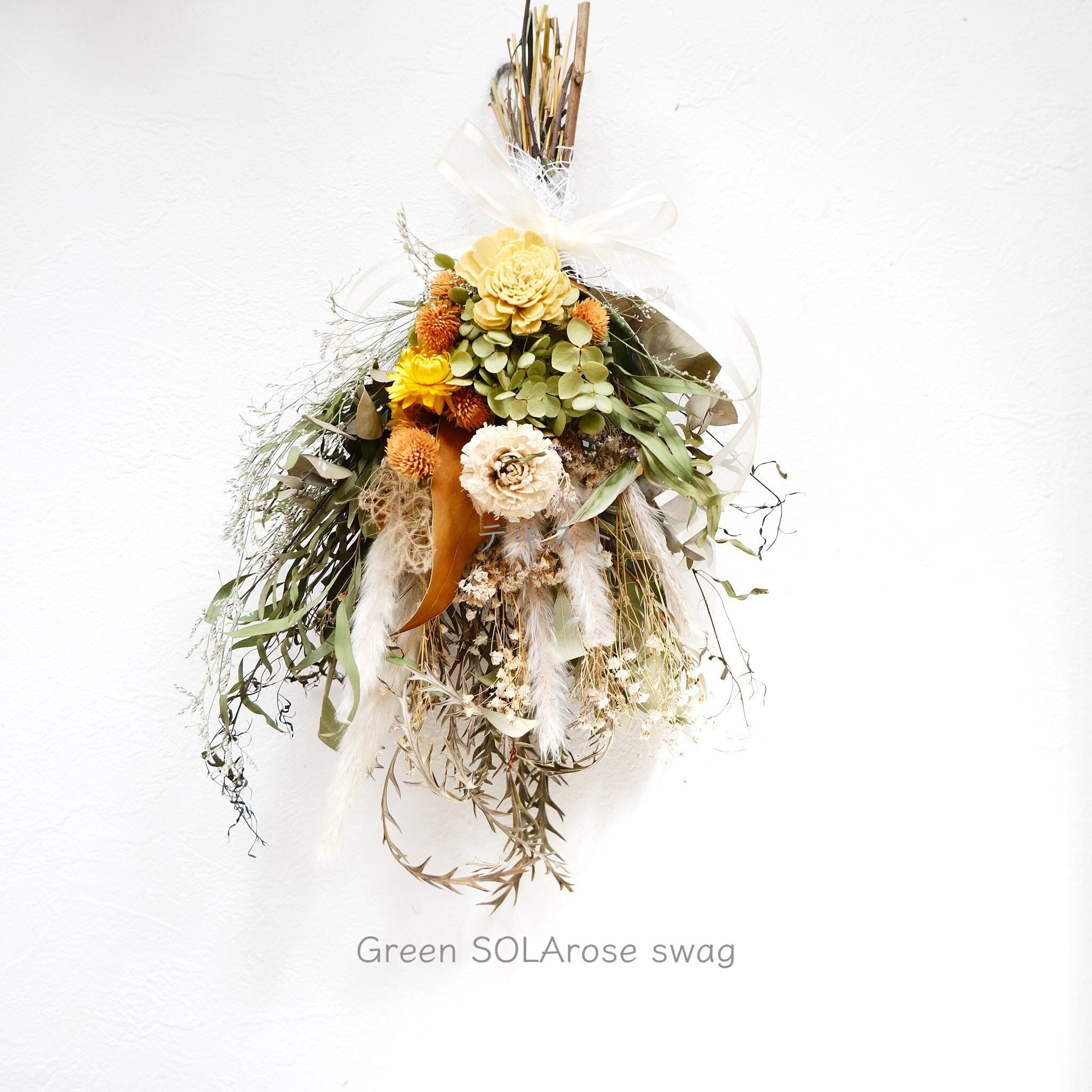 ソラのきで作られたソーラーローズやシダローズ、オレンジの千日紅など明るい色とかすみ草などの小花と合わせた花束のようなスワッグです。