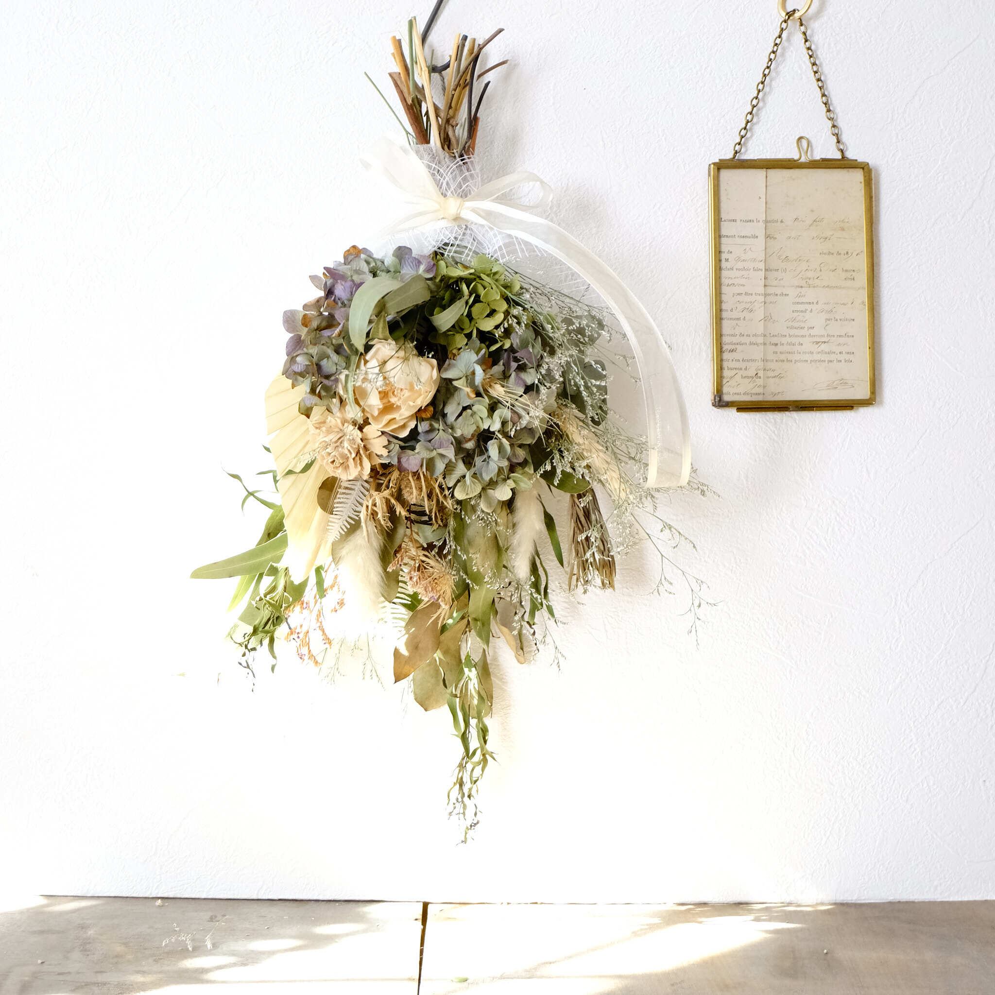 ユーカリとリモニウム、秋色紫陽花を使ったボリュームのあるスワッグ。